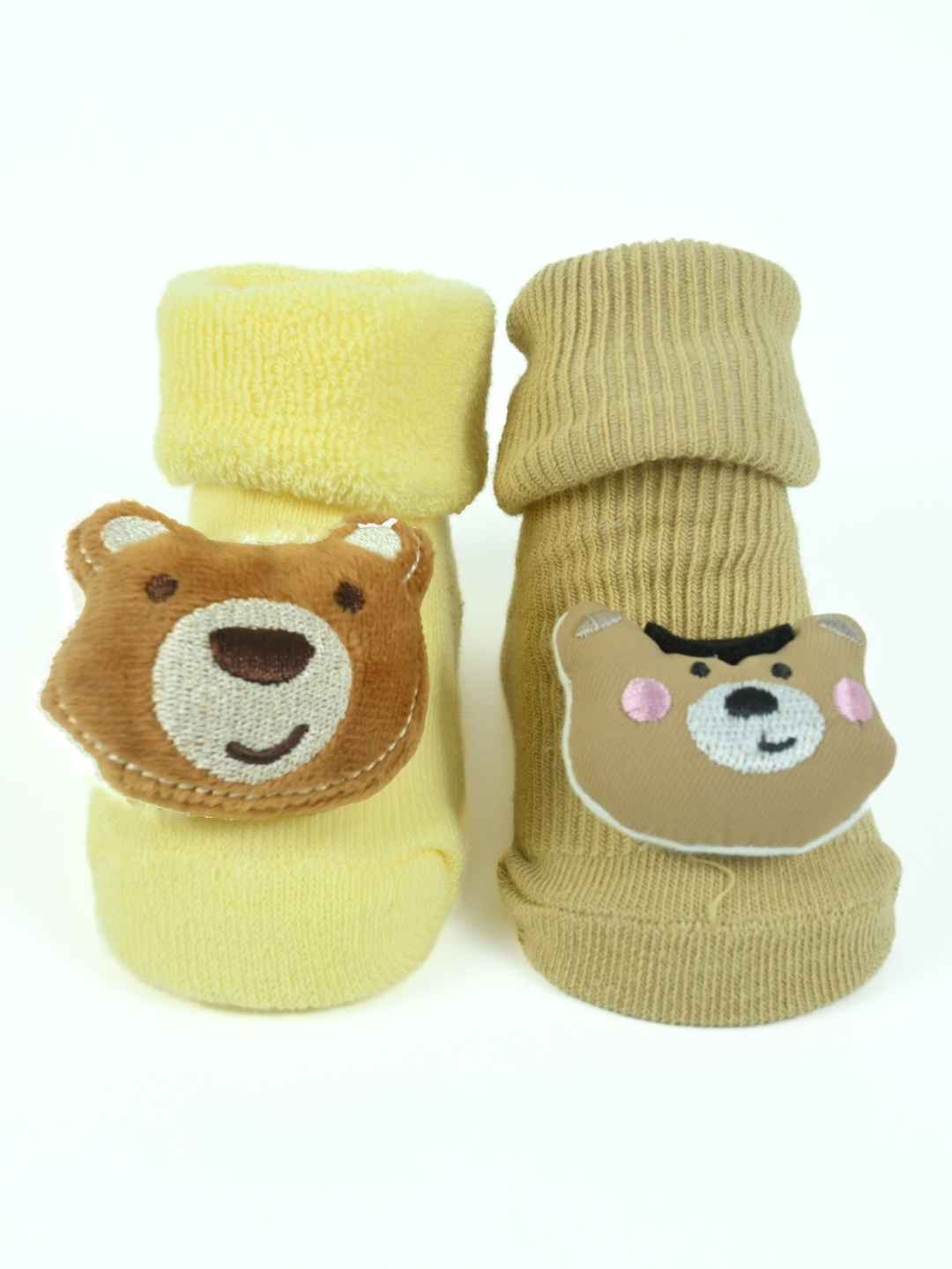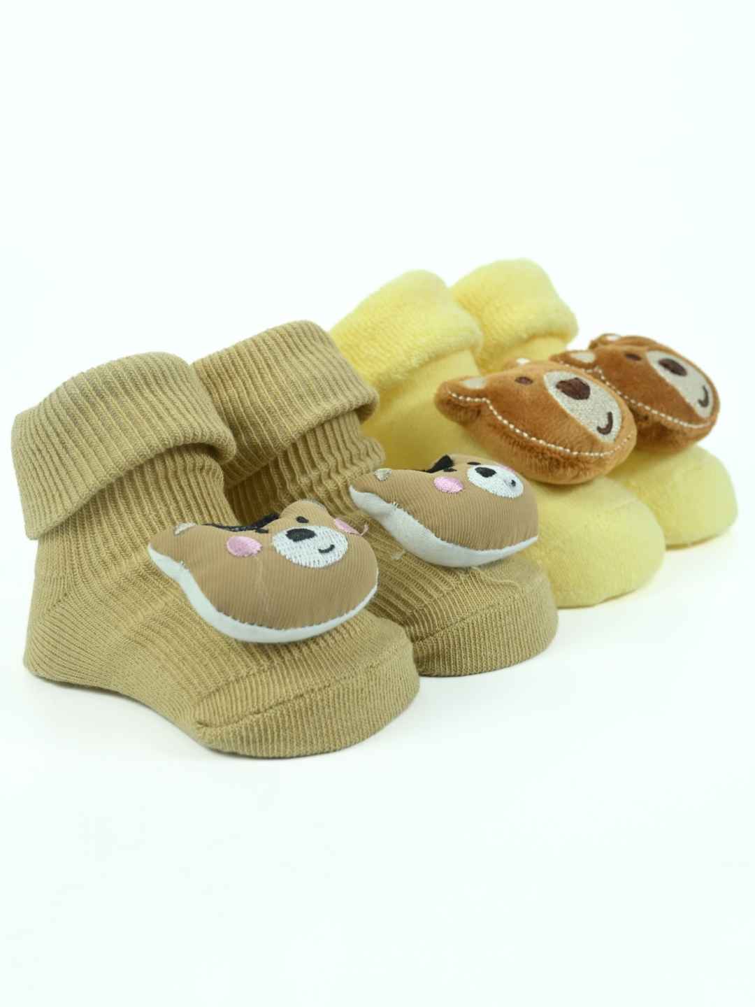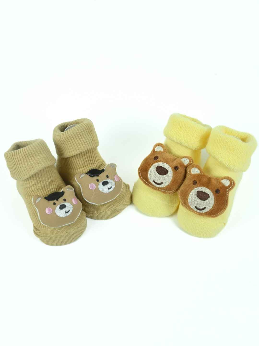 Wrap your baby boy's tiny feet in adorable comfort with the Snuggle Critters Baby Socks Pack by Yellow Bee. This charming set includes two pairs of doll-head socks featuring irresistibly cute 3D teddy bear faces. Crafted from ultra-soft cotton and styled in soothing blue and brown tones, these socks ensure a cozy fit while adding a playful flair to your baby’s outfit. Whether it’s for a stroll in the park or a cozy day indoors, these socks are as functional as they are fun—keeping little toes warm and steady with their secure, non-slip grip.