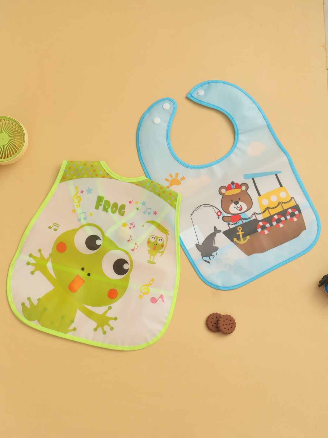 Adorable Dual Design – One bib showcases a charming bear on a sunny blue boat, and the other features a cheerful green frog and friends in a musical theme for mealtime fun.