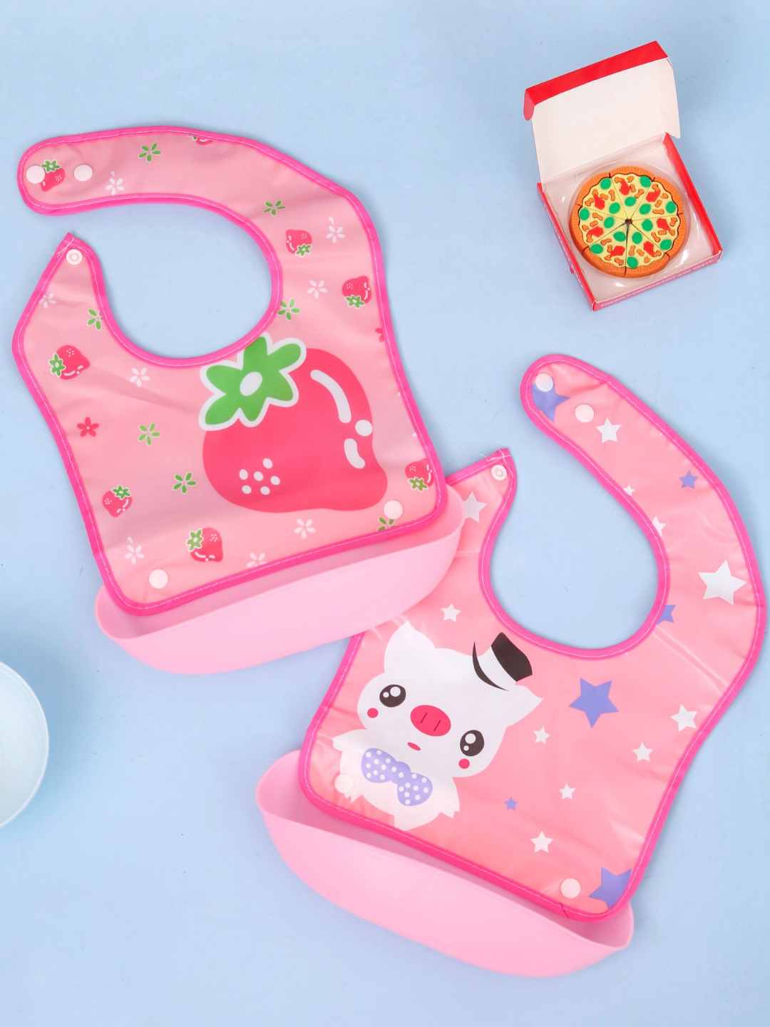 Charming Dual Designs – Includes a playful Sweet Strawberry Cup bib and a stylish Starry Pink Kitty bib with bowtie, perfect for brightening up mealtime.