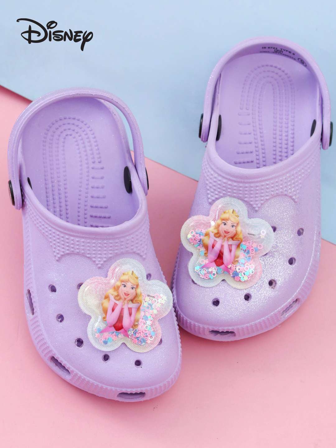 Let your little princess shine with Yellow Bee Girls’ Disney Princess Aurora Glitter Clogs with Floral Sequins Charms – Purple. Designed in a soft lavender shade, these Glitter Clogs feature a charming floral-shaped sequin charm with a bright, beautiful illustration of Princess Aurora. Made from premium EVA, they offer lightweight comfort, breathability, and durability—making them the perfect footwear choice for fashion-loving girls who adore Disney magic.