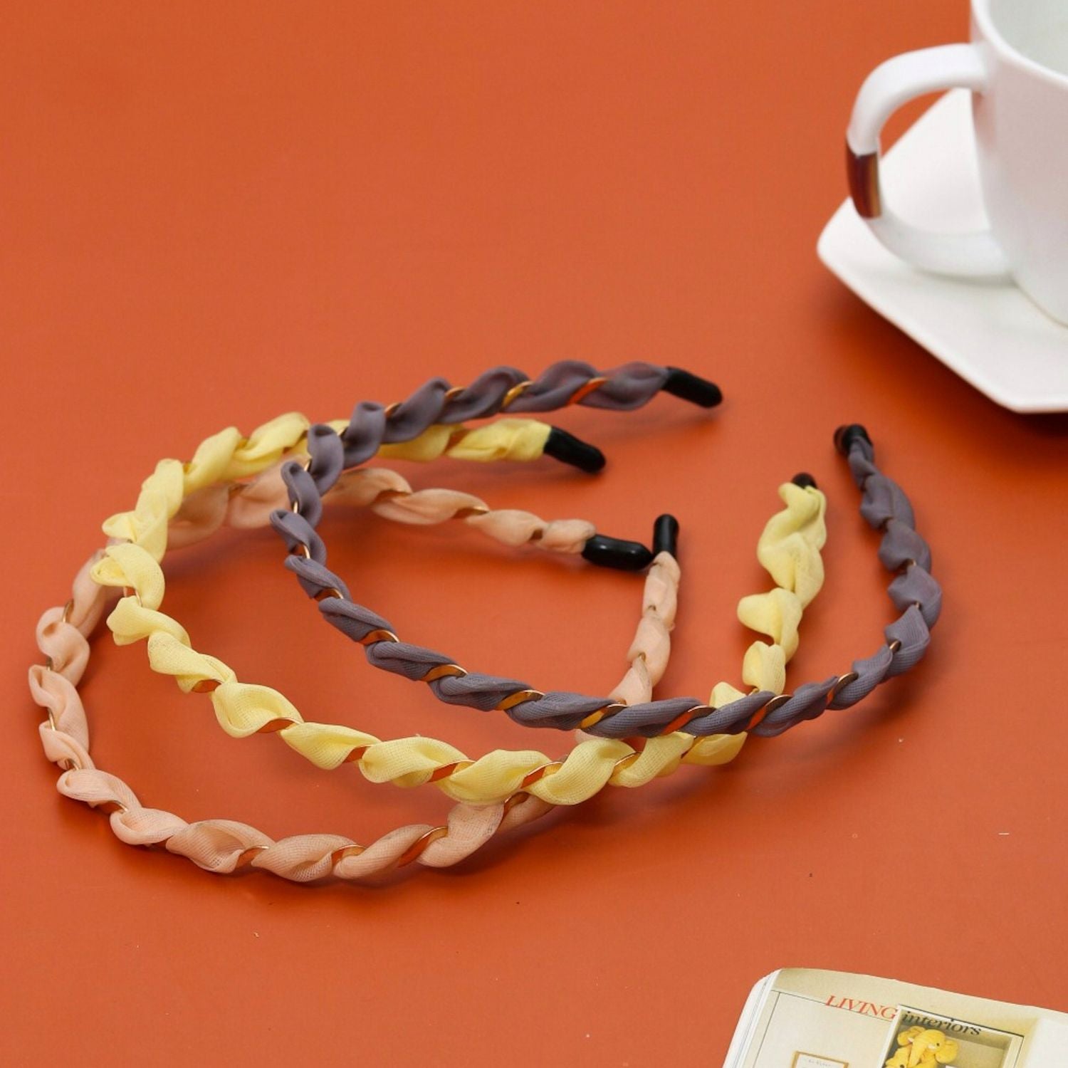 Sophistication in Every Twist: Yellow Bee's Braided Hair Bands Set Introducing Yellow Bee's set of 3 braided hair bands, exquisitely designed in shades of yellow, grey, and peach. These bands are perfect for adding a sophisticated twist to any ensemble, from everyday office wear to special party outfits. Each band is crafted from skin-friendly plastic and encased in a dual-layer of soft, smooth fabric, ensuring a comfortable fit that stays in place without tangling your hair.