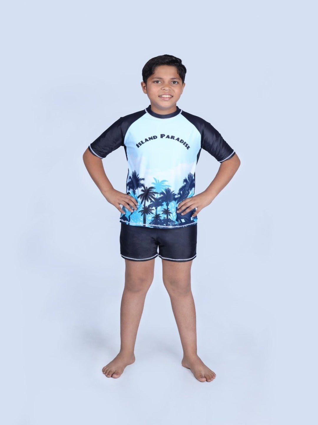 Whisk away to a tropical retreat with every splash in Yellow Bee's All Over Palm Trees Printed Swimsuit for Boys. This retro-style swim set blends the nostalgia of yesteryears with today's high-performance fabric, ensuring your little one is the coolest kid on the beach or at the pool.
