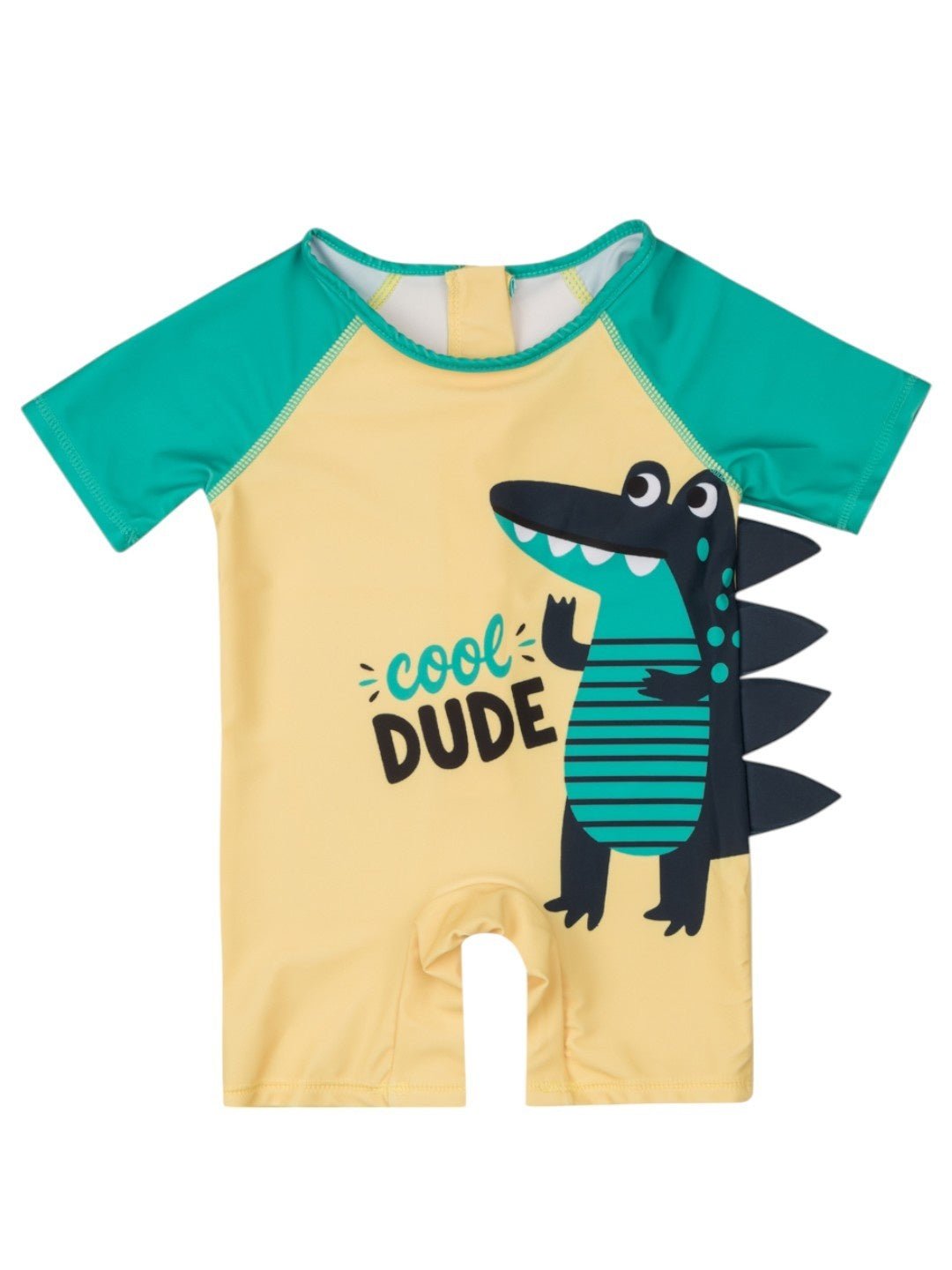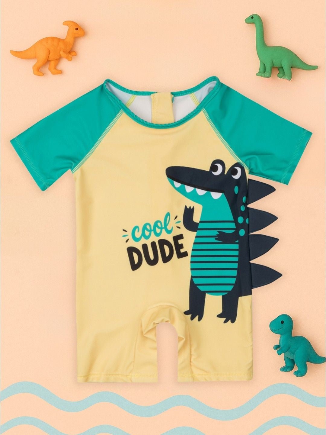 Boys’ “Cool Dude” Dinosaur Romper Swimsuit with 3D Tail & Spikes Design- Yellow
