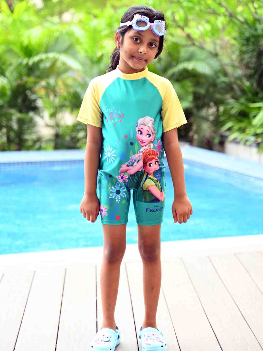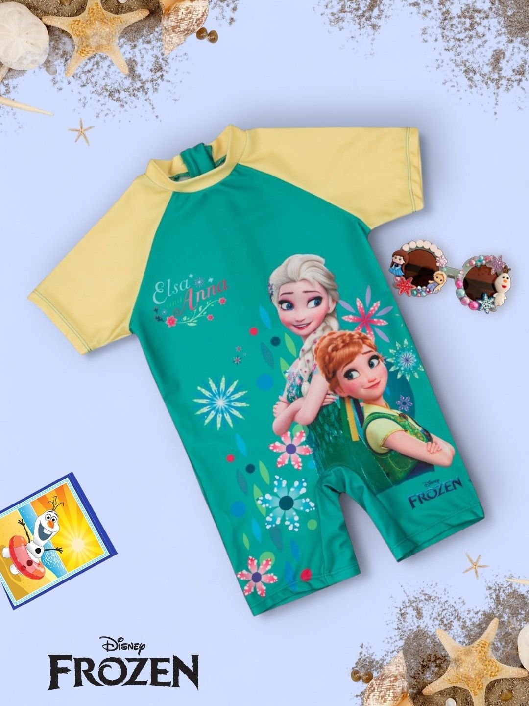 Yellow Bee Girls’ Disney Frozen Swimsuit with Elsa & Anna Print- Green