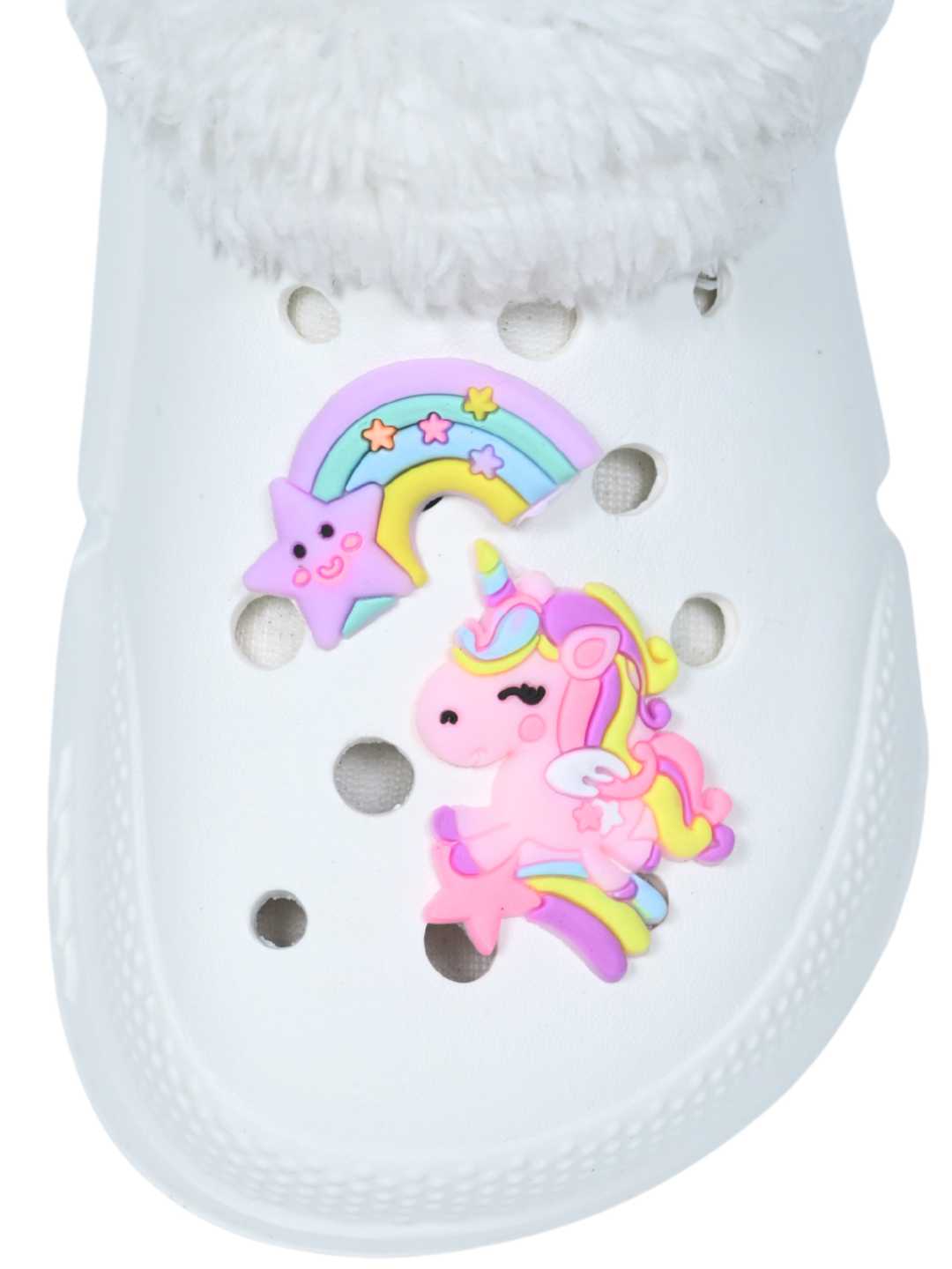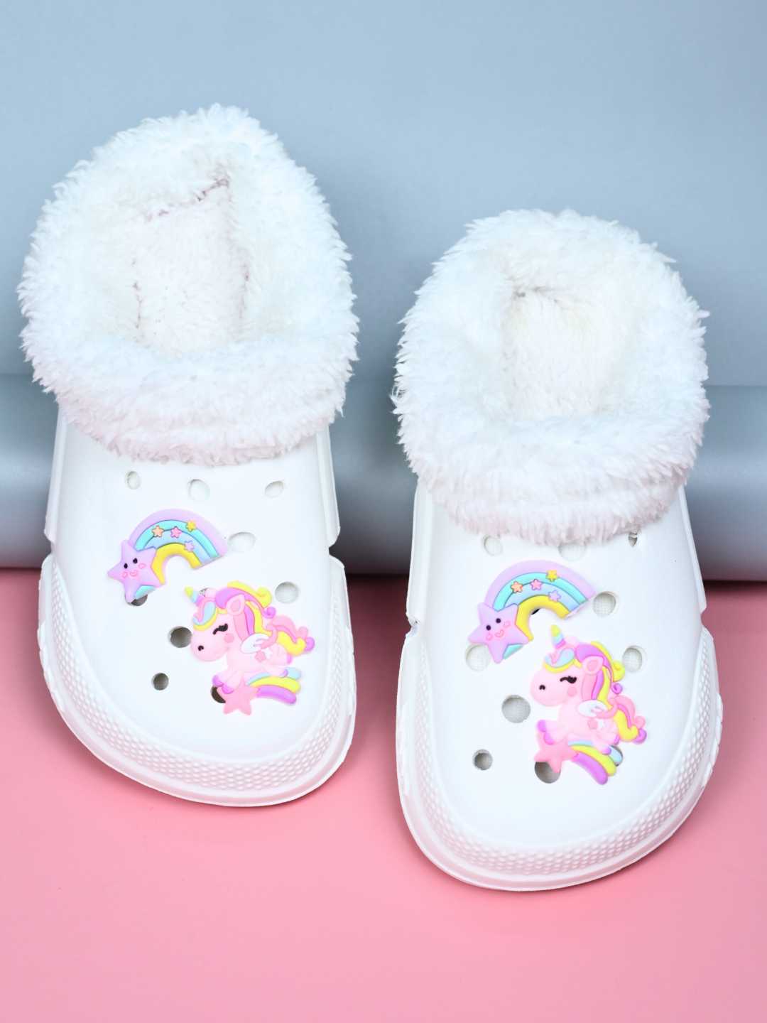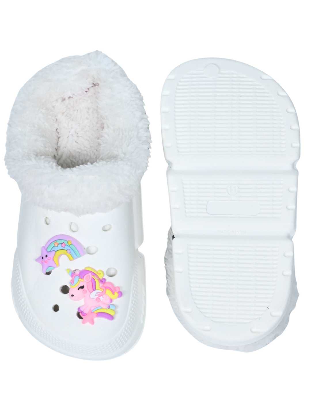 Dreamy Winter Plush Lined Clogs with Cute Unicorn & Rainbow Charms for Girls - White
