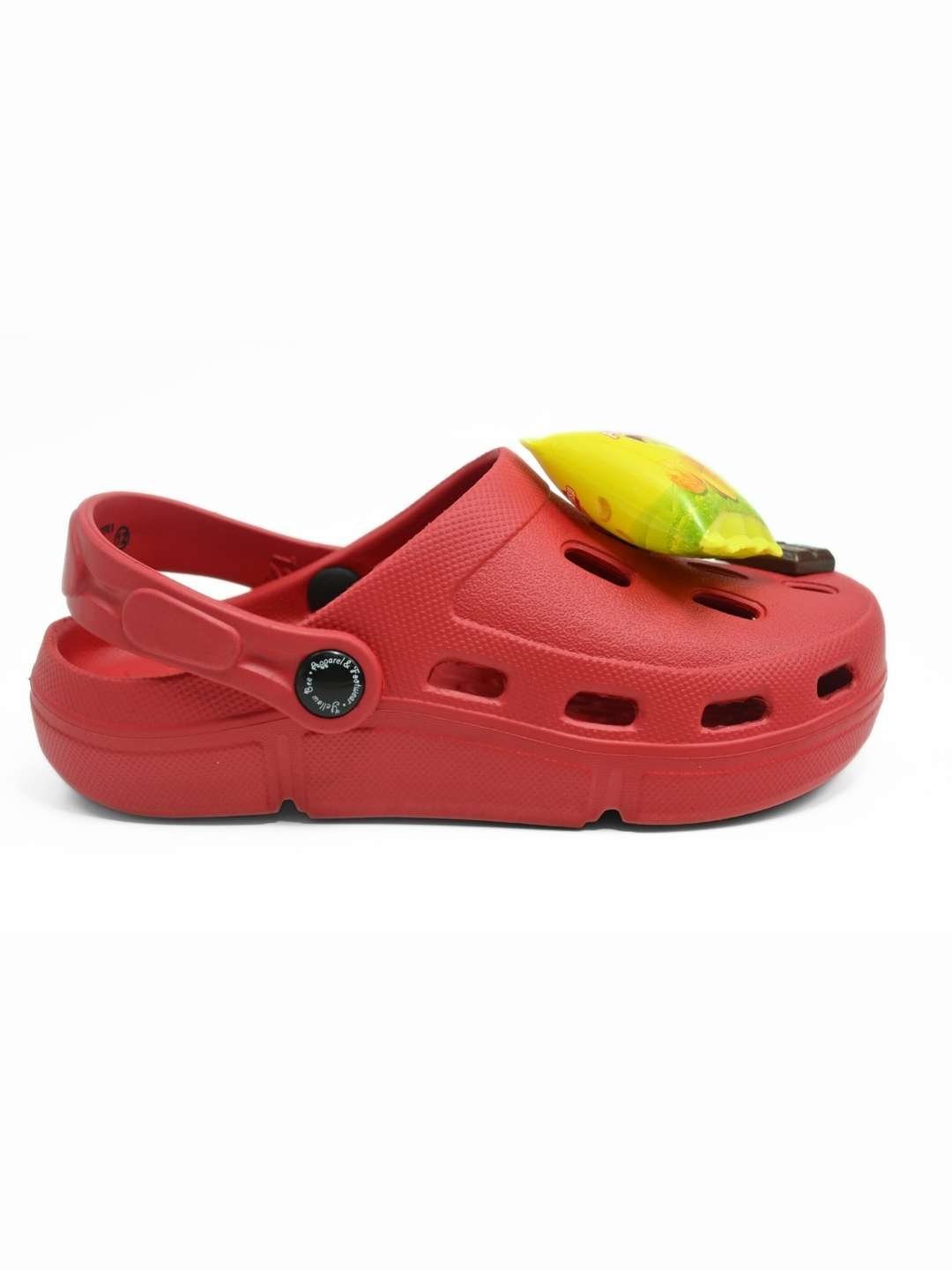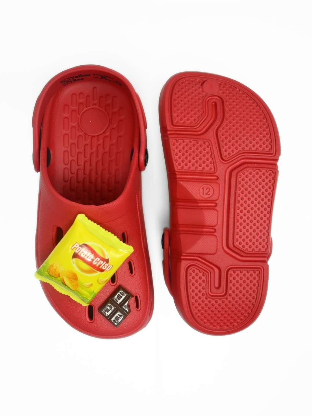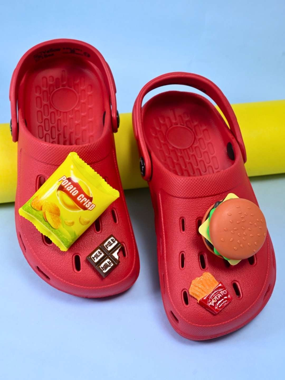 Make every step a treat with the Yellow Bee Playful Clogs with Burger, Fries & Chocolate Charms for boys. Designed in a striking red color, these clogs feature cheerful 3D food-themed charms that make them stand out in any crowd. Crafted from high-quality EVA material, they are lightweight, flexible, and water-friendly, making them perfect for daily wear. The clog design allows for easy slip-on comfort, while the breathable cut-outs keep little feet cool and fresh.