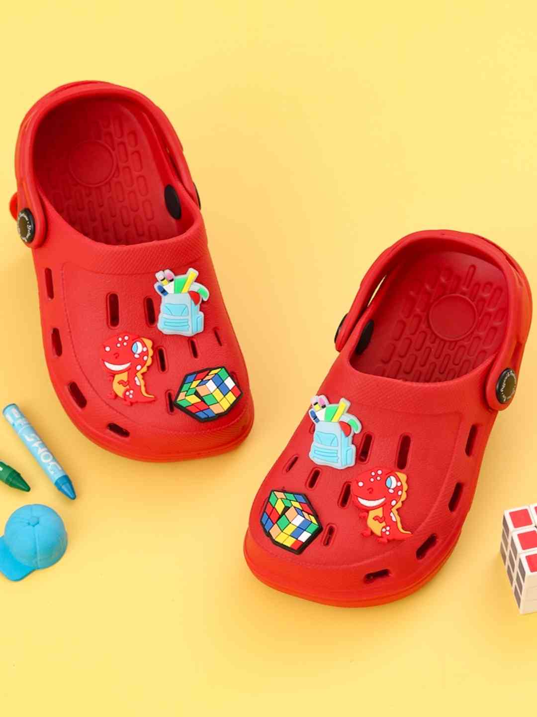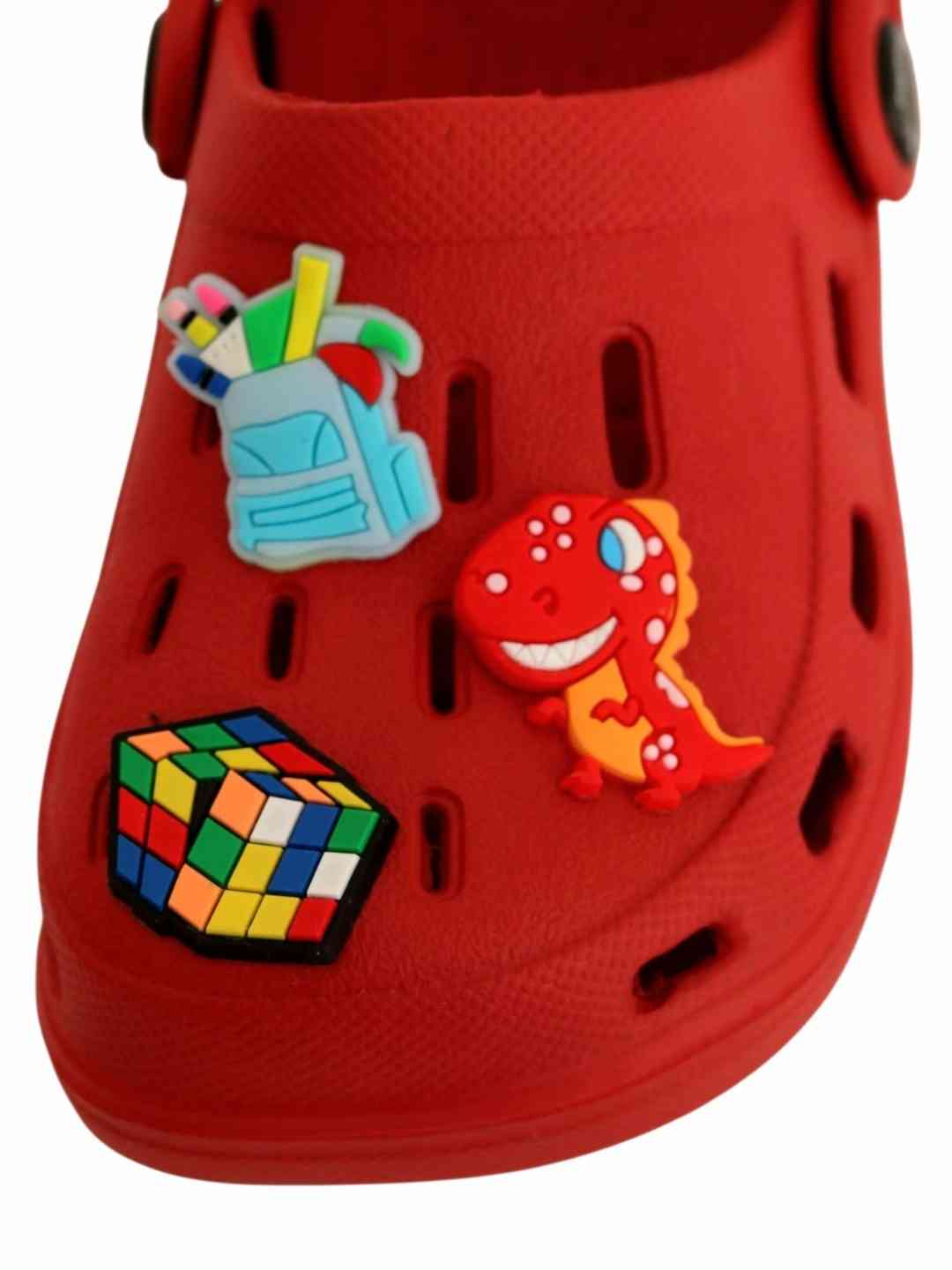 Playful Red Clogs with Backpack, Dinosaur & Puzzle Cube Charms for Boys