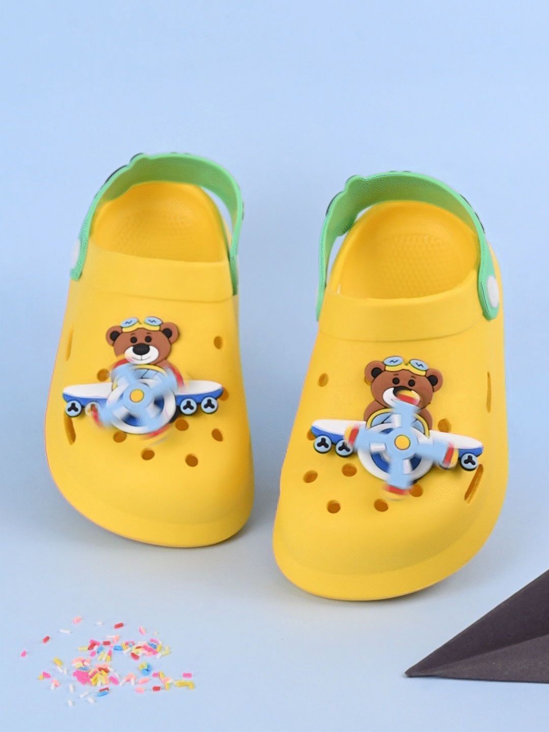 Let your little aviator’s imagination soar with Yellow Bee’s Space Adventure Theme Clogs in vibrant yellow, featuring an endearing rotating 3D Pilot Bear & Airplane charm. Crafted for comfort and style, these playful EVA sandals are built to support every tiny step—whether he's jetting around the park or cruising through his next backyard mission. A fun blend of comfort, character, and motion, these clogs are the perfect choice for boys who dream big!