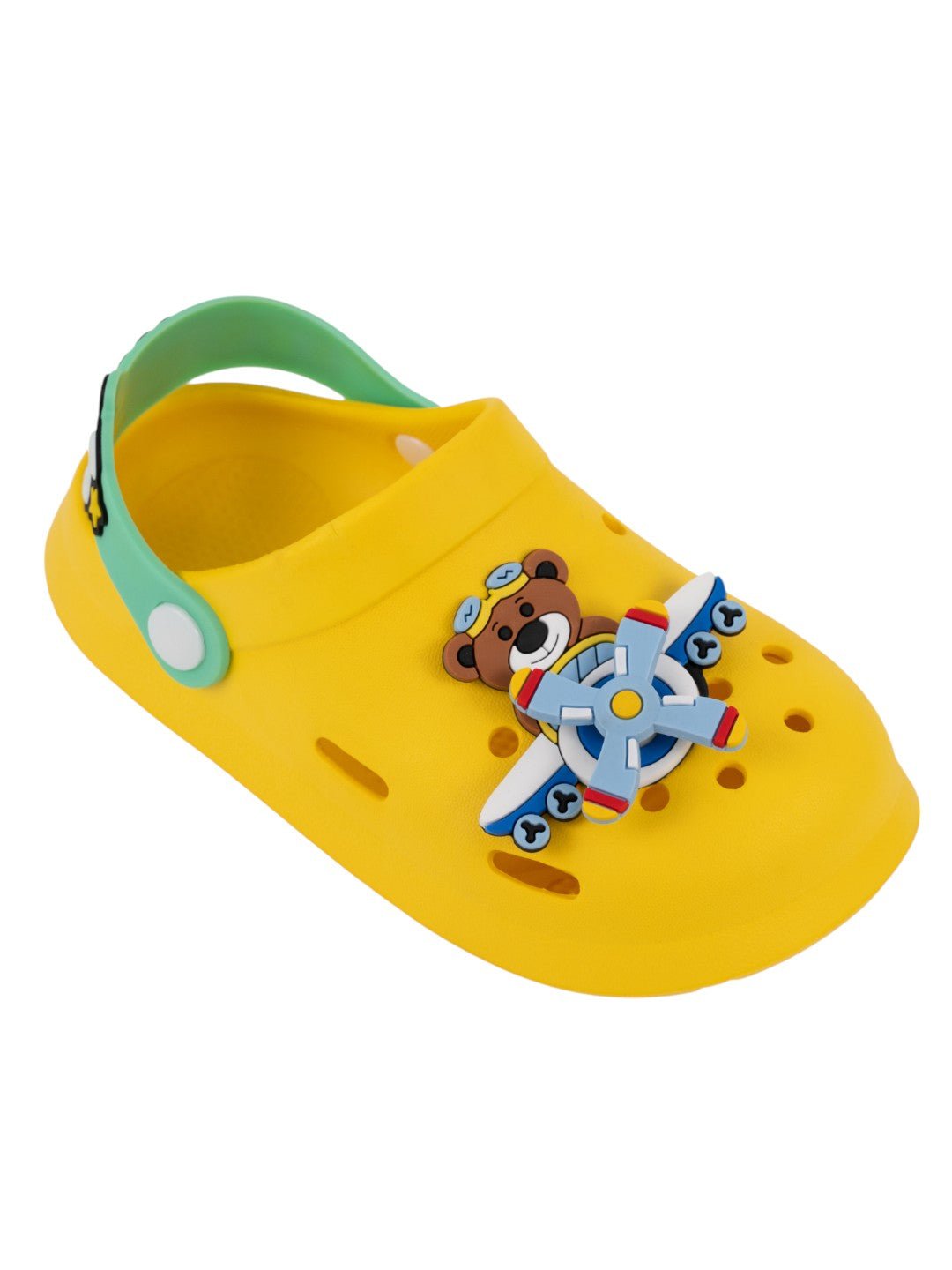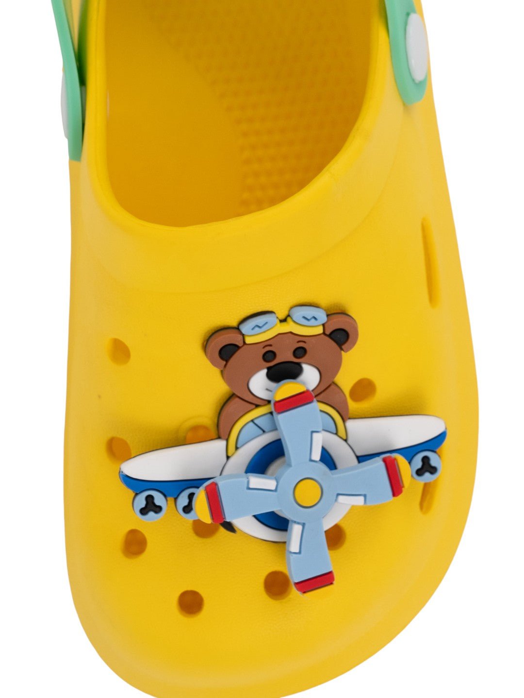 Space Adventure Theme Clogs with Rotating Pilot Bear & Airplane Charms for Boys – Yellow