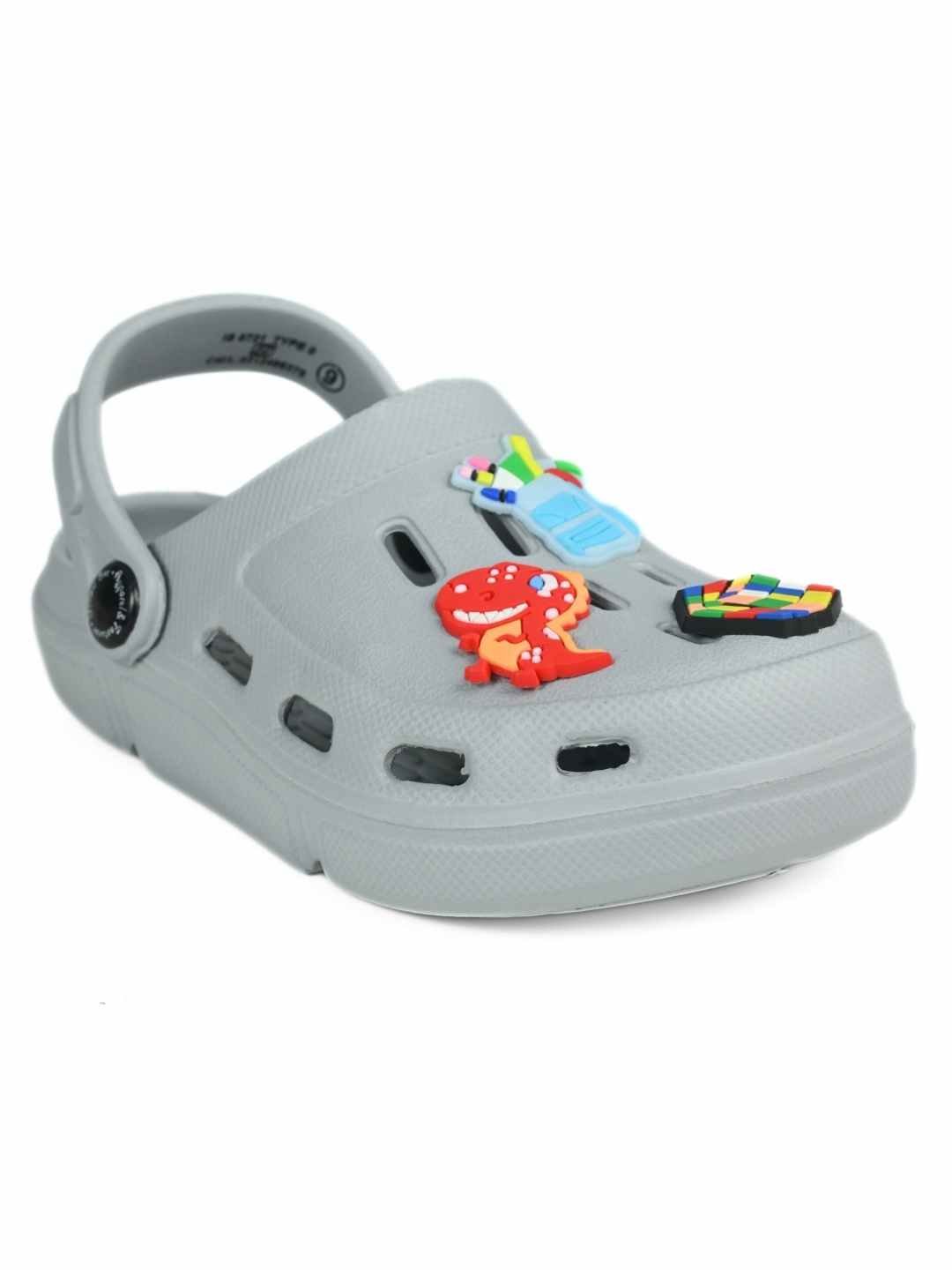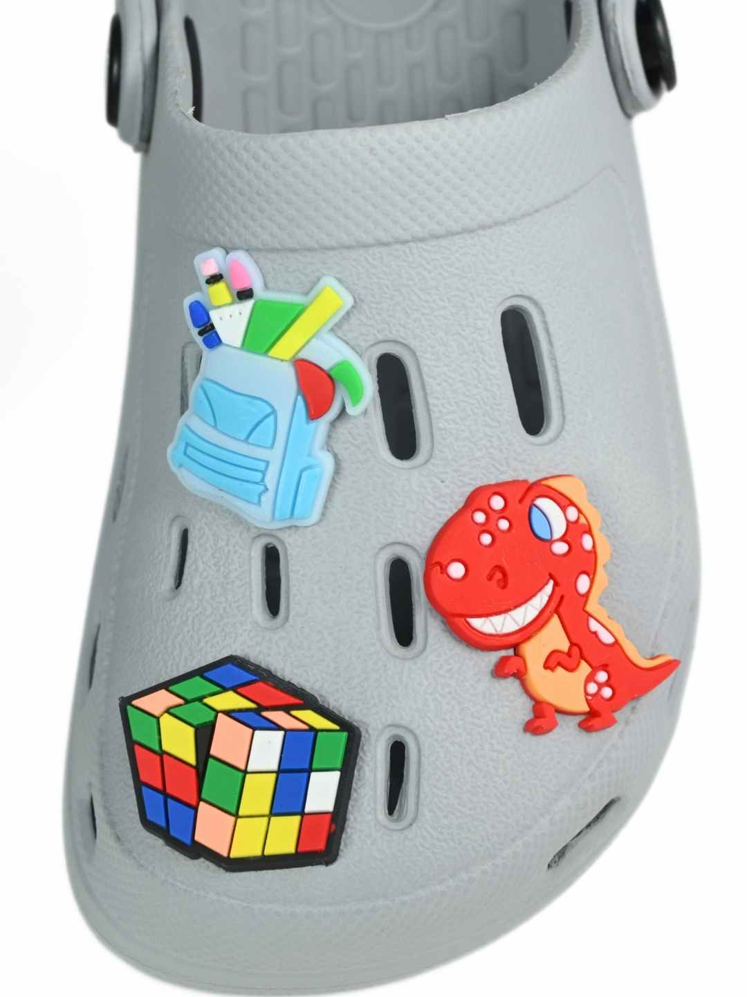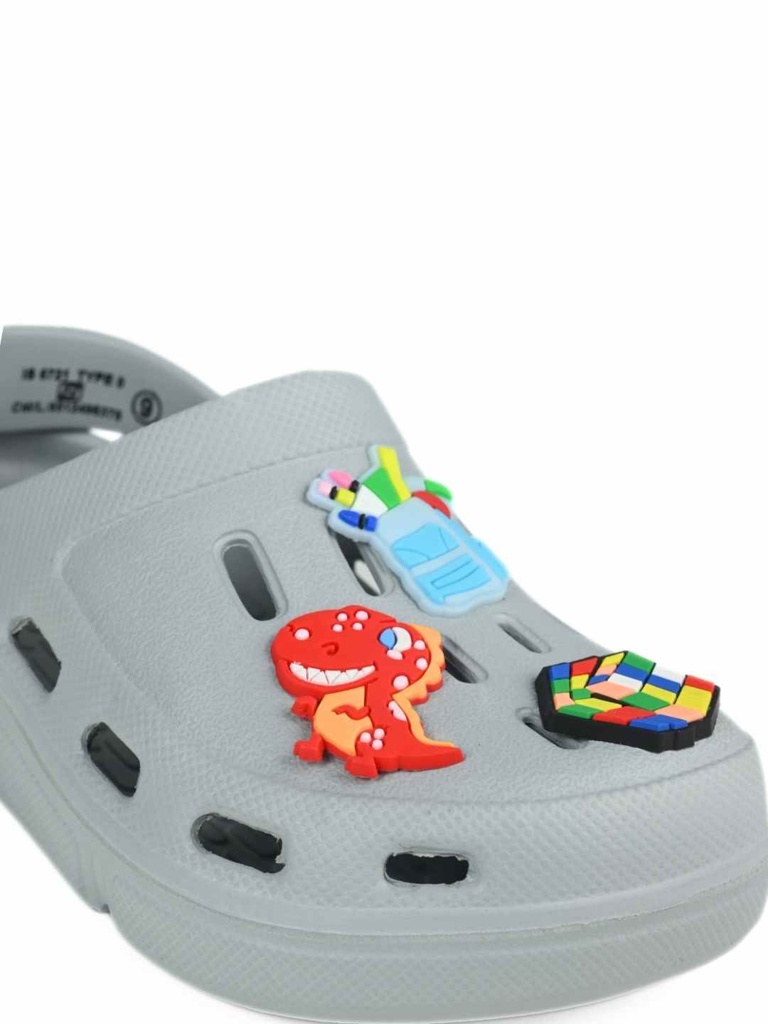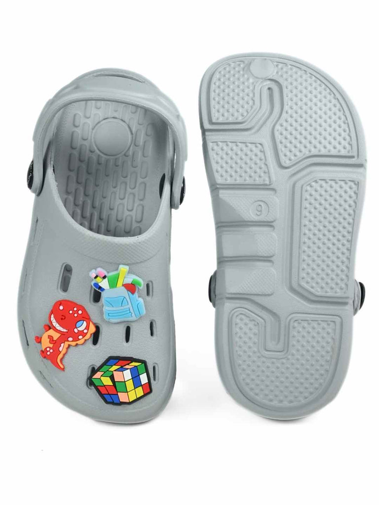 Trendy Grey Clogs with Backpack, Dino & Cube Charms for Boys