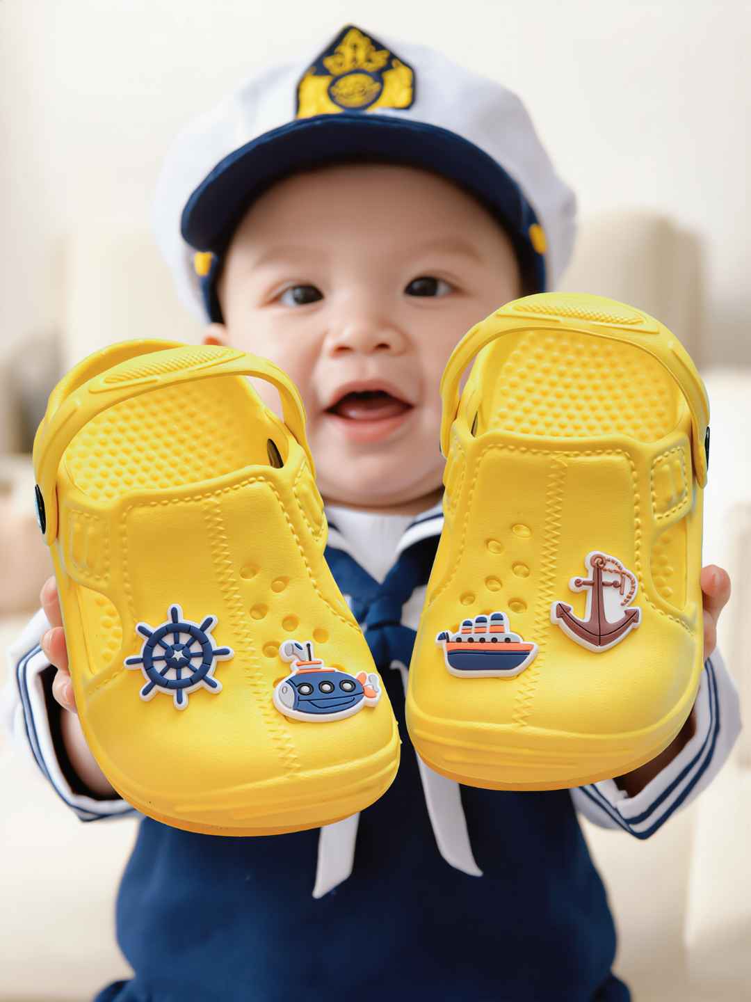 Add a burst of sunshine and seaside adventure to her everyday look with the Yellow Bee Playful Anchor, Ship & Steering Wheel Charm Clogs for Boys in Yellow. Designed in a cheerful, eye-catching shade, these clogs blend playful nautical elements with everyday comfort. Made from soft, lightweight EVA material, they ensure easy movement while the charming details bring fun to every step—perfect for active little explorers.