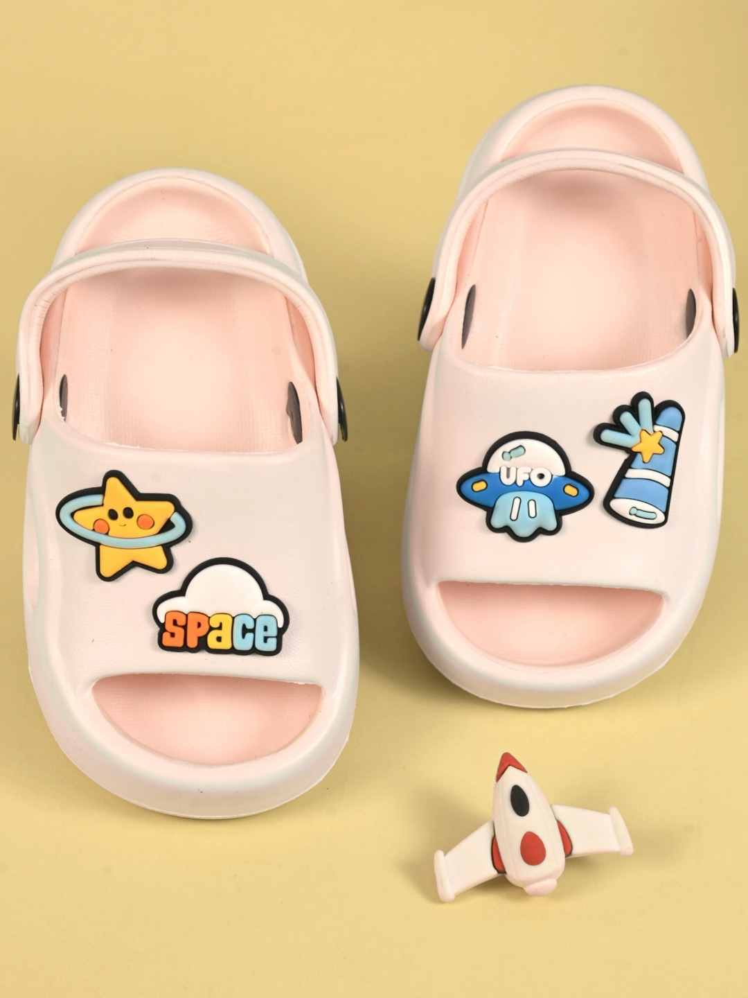 Let your little one explore the universe in style with the Yellow Bee Space Fantasy Star & UFO Charm Sandals for Girls. Crafted in a sweet pink tone, these sandals come decorated with vibrant space-themed charms that instantly catch the eye. The lightweight EVA design makes them easy to sling-back closure, while offering durability for everyday adventures. Perfect for kids who love playful fashion with a touch of fantasy.