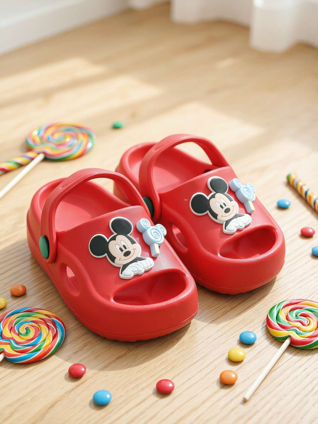 Make every step playful and comfortable with the Yellow Bee Boys Disney Mickey Mouse & Lollipop Design Sandals in Red. Designed with an adorable Mickey Mouse face and candy-inspired lollipop charm, these sandals bring iconic Disney fun to your child’s everyday look. Crafted from lightweight EVA material, they offer superior comfort, while the bold red color adds a vibrant and energetic touch perfect for active little boys.