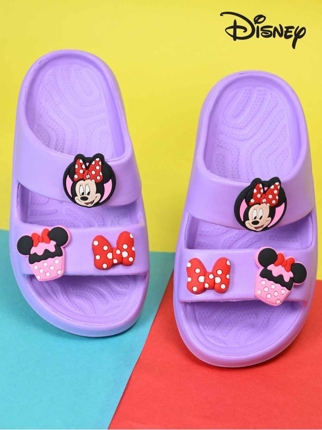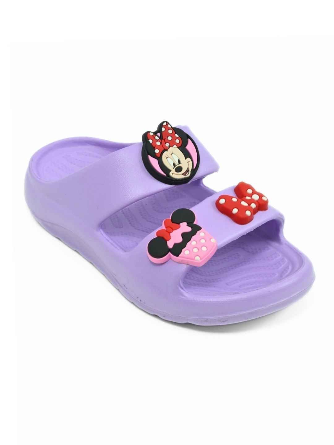 Yellow Bee Girls’ Disney Minnie Mouse Slides with Bow & Cupcake Charms- Purple