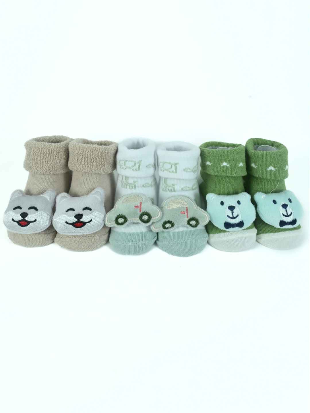 Cuddly Trio Baby Bootie Set – Car, Bear & Kitty Soft Knit Socks with Character Appliqués