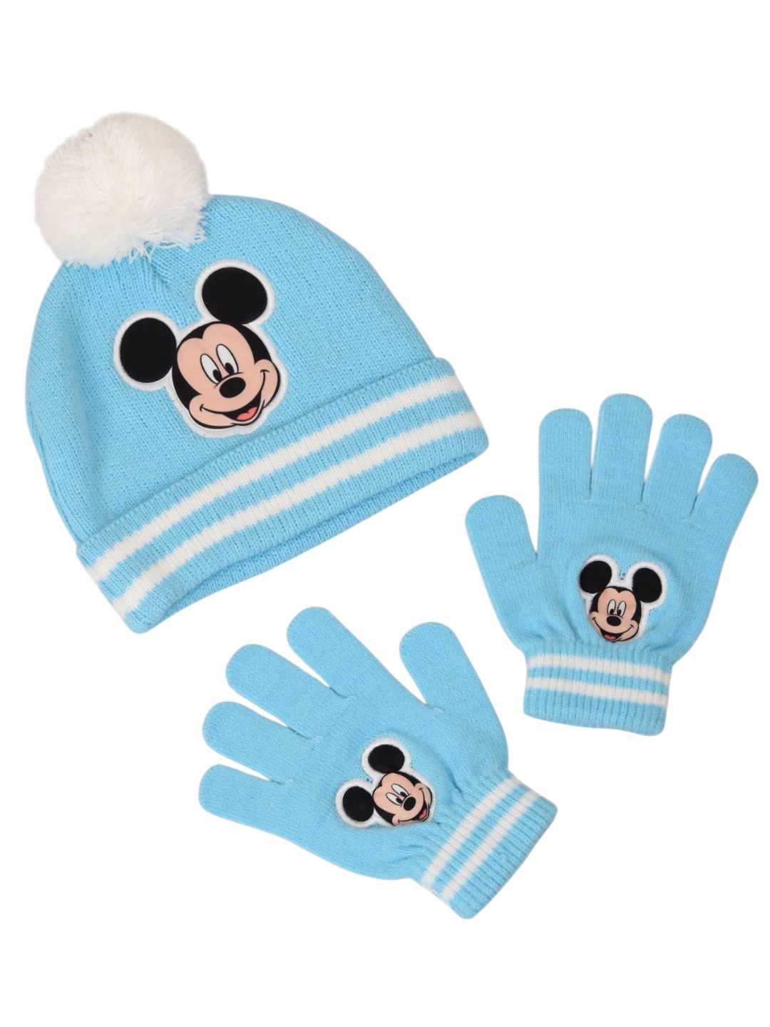 Yellow Bee Boy's Disney Mickey Mouse Pom Pom Winter Hat With Gloves Set- Blue