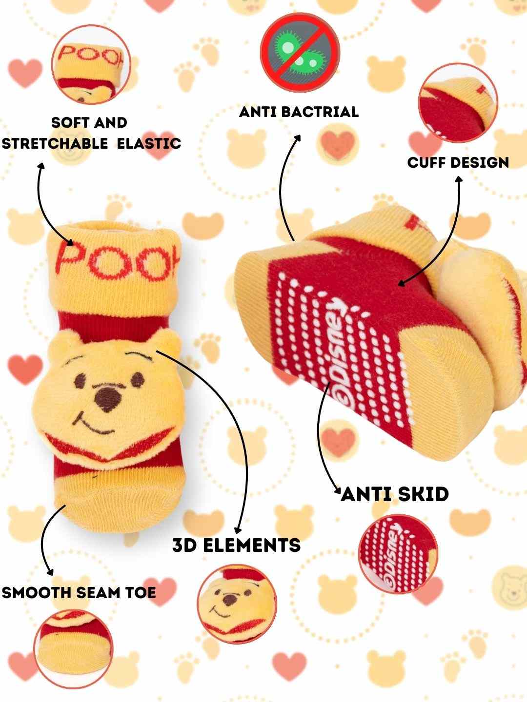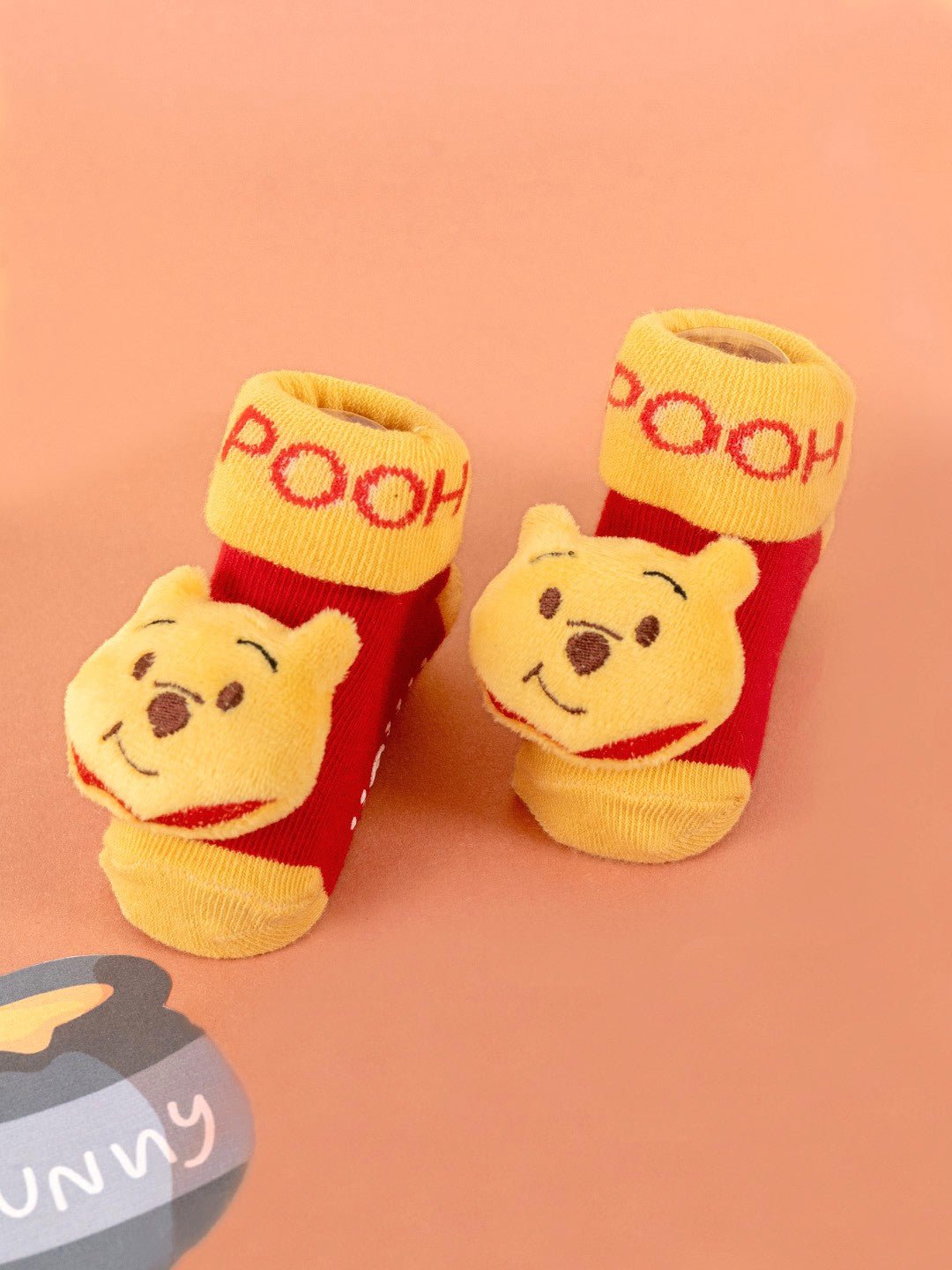 Bring the magic of the Hundred Acre Wood to your child’s wardrobe with the Yellow Bee Boys' Disney Winnie the Pooh 3D Socks! These adorable socks feature the lovable Pooh Bear in a soft 3D plush form, paired with cheerful yellow and red tones that capture the warmth of this iconic character. Designed with comfort, charm, and safety in mind, these socks are perfect for adding a dash of fun to everyday wear. Whether your little one is crawling, playing, or napping, these socks ensure comfort and cuteness in every step. The anti-skid sole helps protect active babies from slips and tumbles, giving parents peace of mind.
