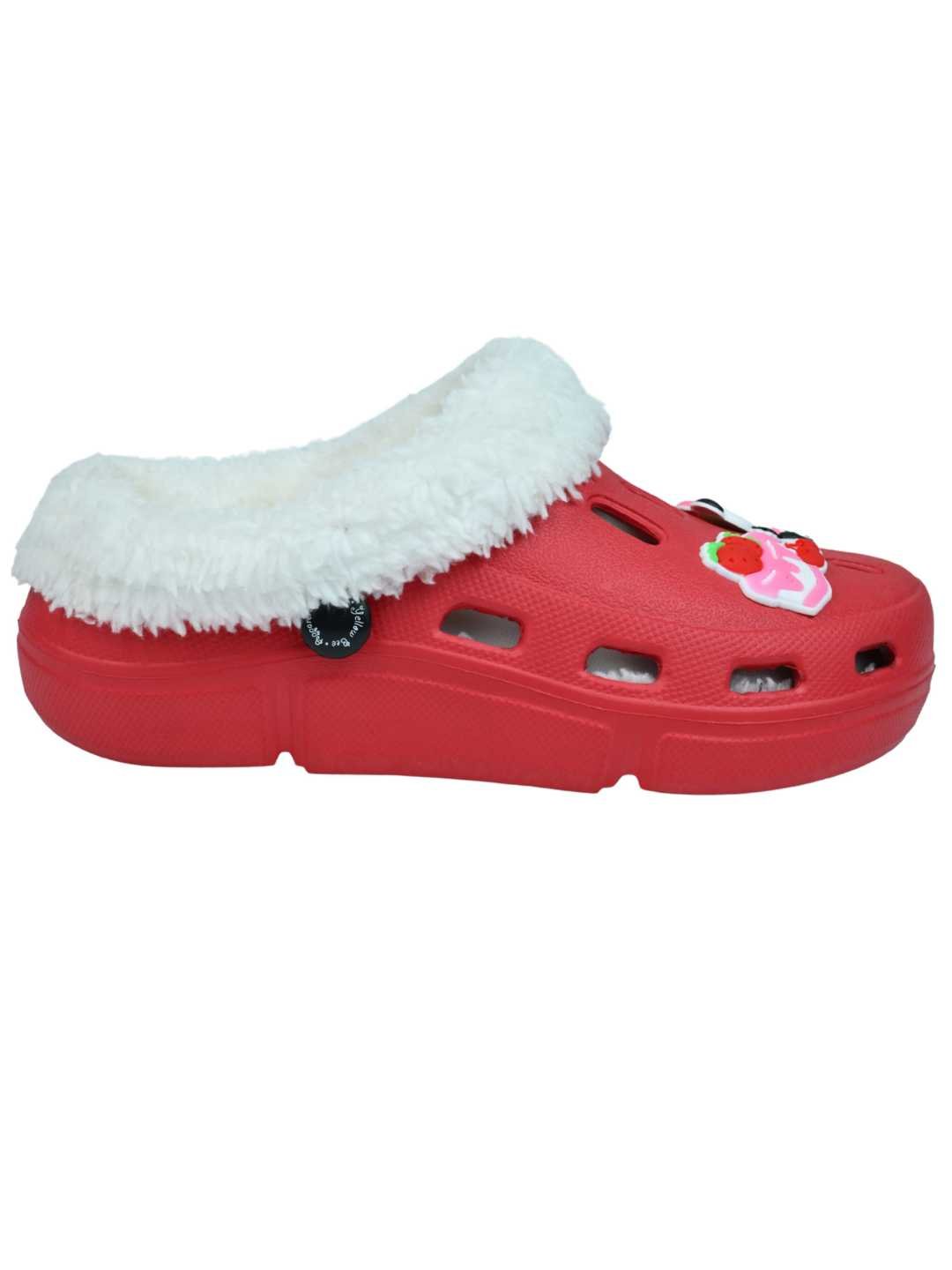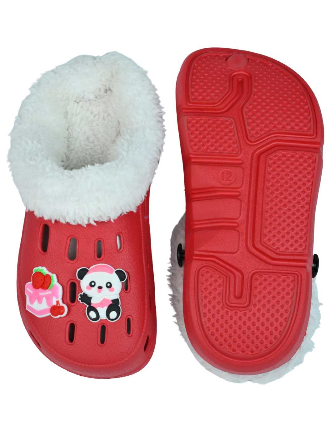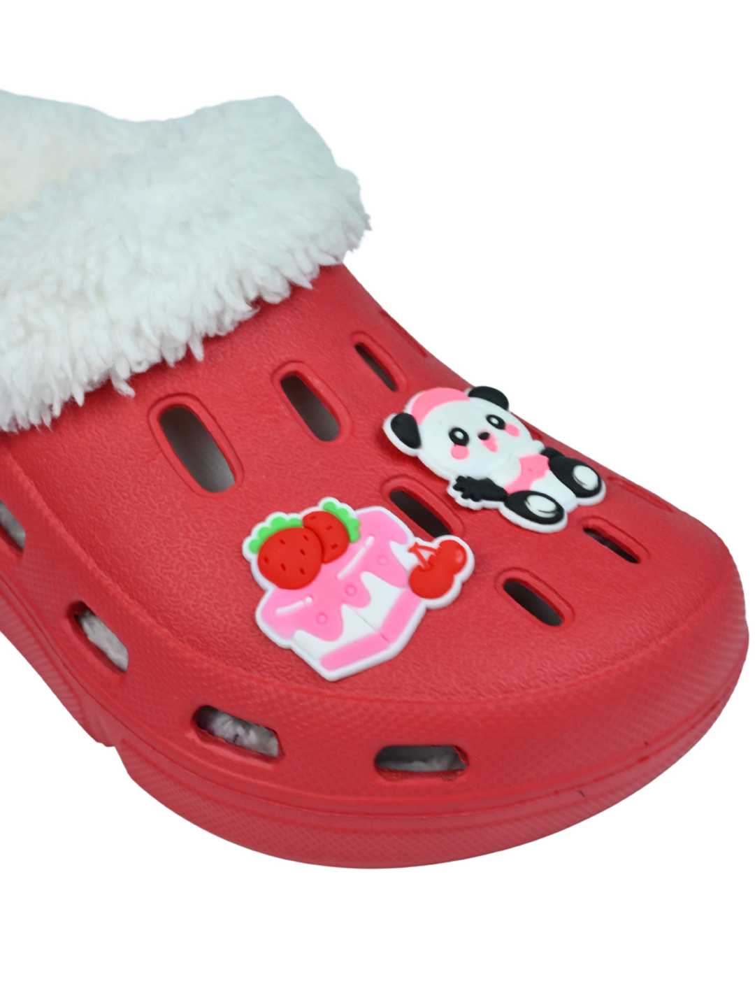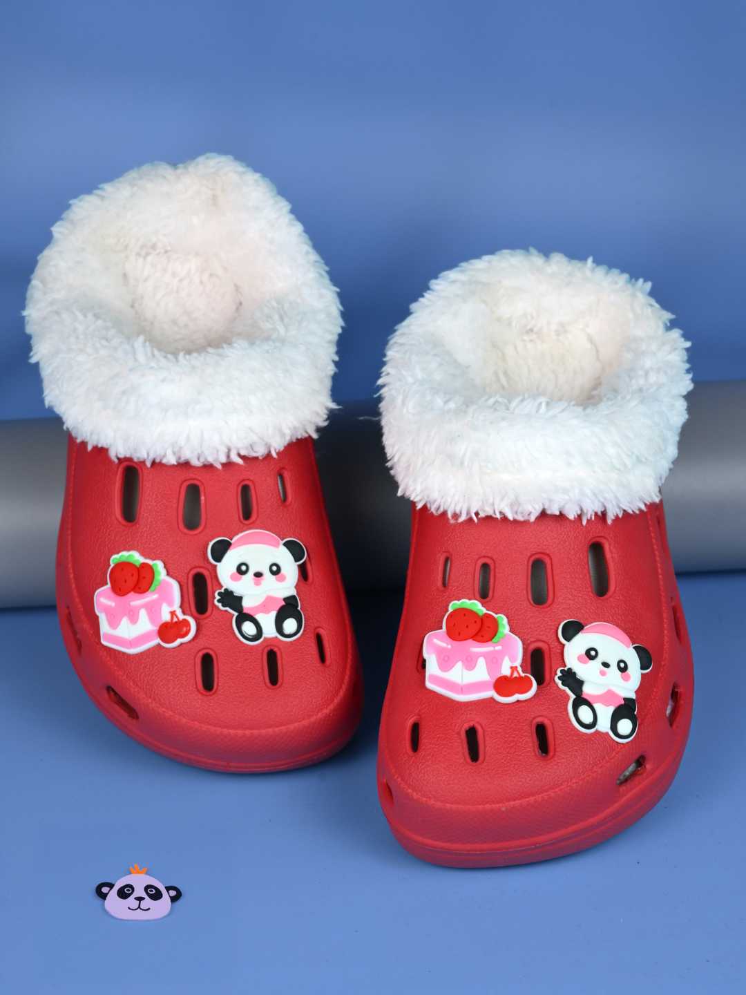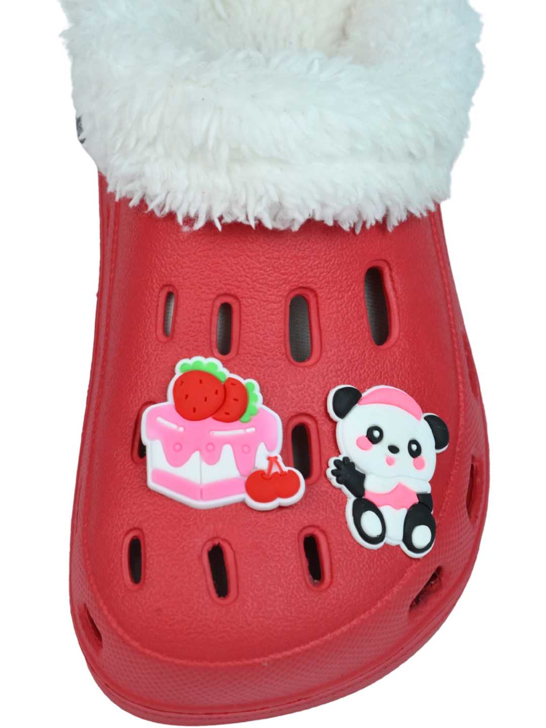 Dreamy Winter Fur Lined Clogs with Panda & Strawberry Cake Charms for Girls - Red