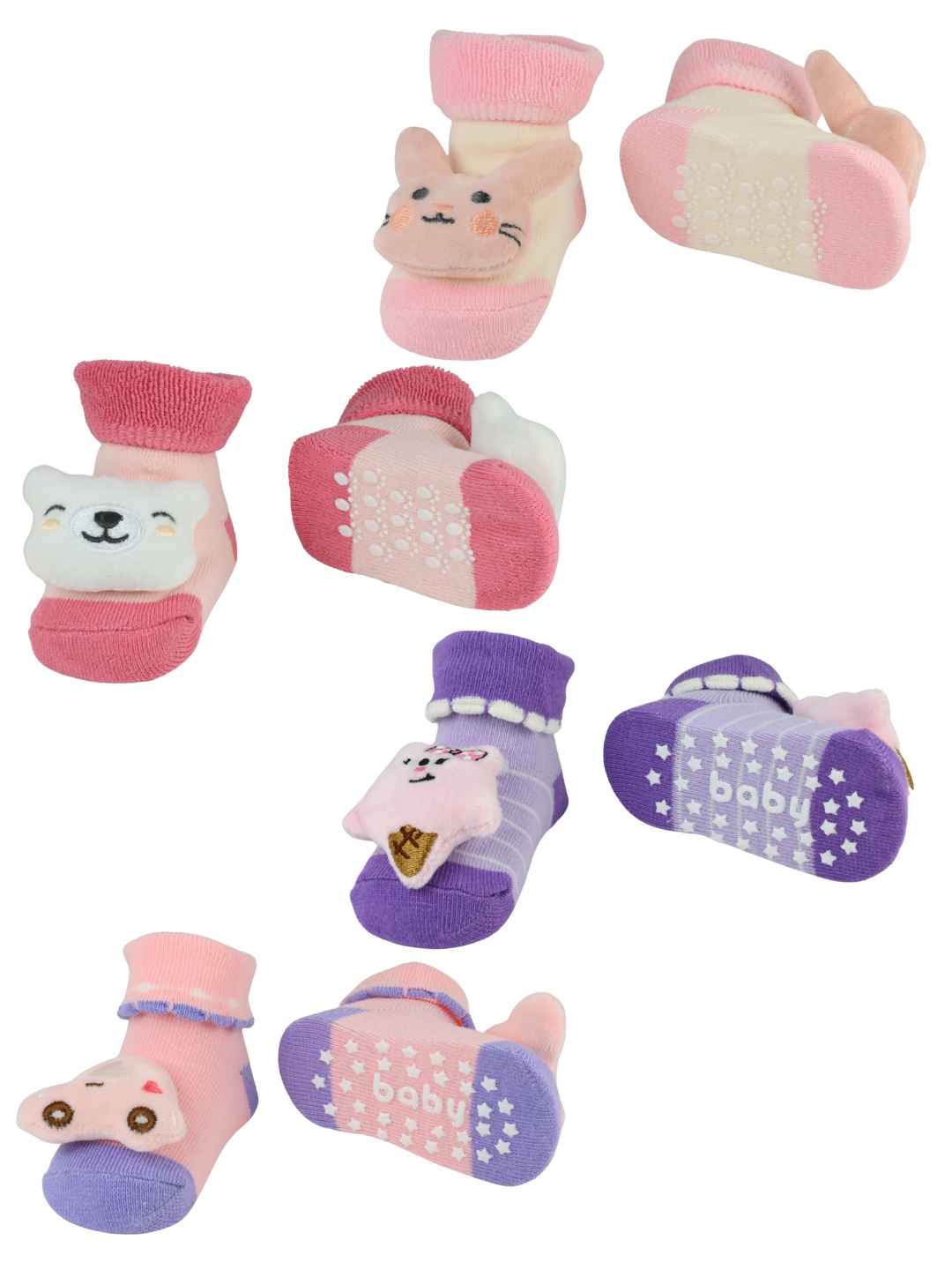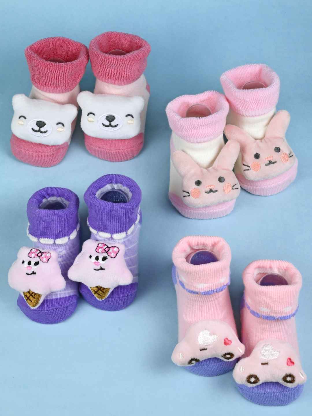 Bring a world of charm and comfort to your little one’s steps with Yellow Bee’s Soft & Playful 3D Character Socks . Featuring an adorable mix of a pink car, smile Ice Cream , cuddly bear, and sweet bunny — each pair adds a burst of fun to everyday dressing. Made from 100% soft cotton, these socks keep tiny feet warm, cozy, and irritation-free. Perfect for active toddlers who love both style and comfort, this set makes every step a joyful one.