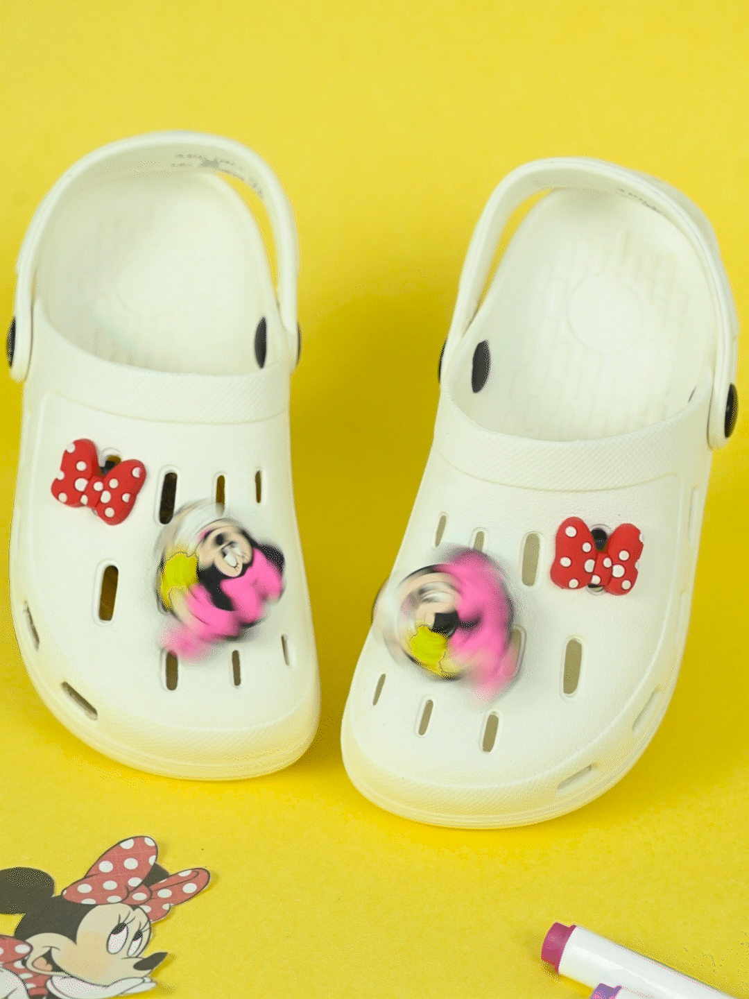 Brighten up your little one’s every step with the Yellow Bee Girls’ Disney Minnie Mouse Rotating Charm Clogs! Featuring vibrant 3D Rotating Minnie Mouse and iconic red bow charms, these adorable white clogs bring Disney magic to life. Designed with comfort and fun in mind, they’re the perfect blend of style and practicality for active kids who love Minnie and adventure alike!