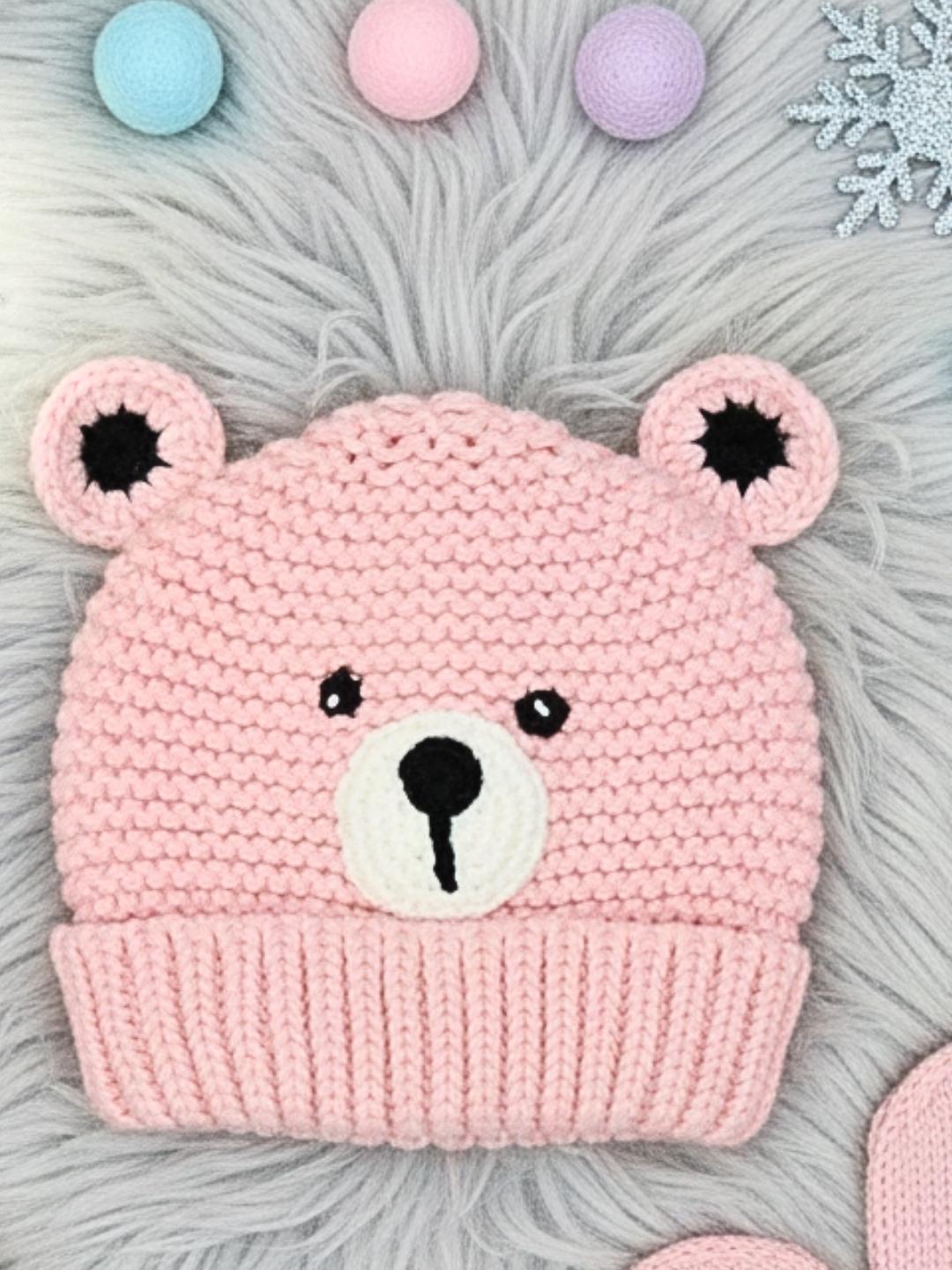 Chic Crochet Teddy Bear Woolen Beanie for Girls, Pink, 6-12 Months