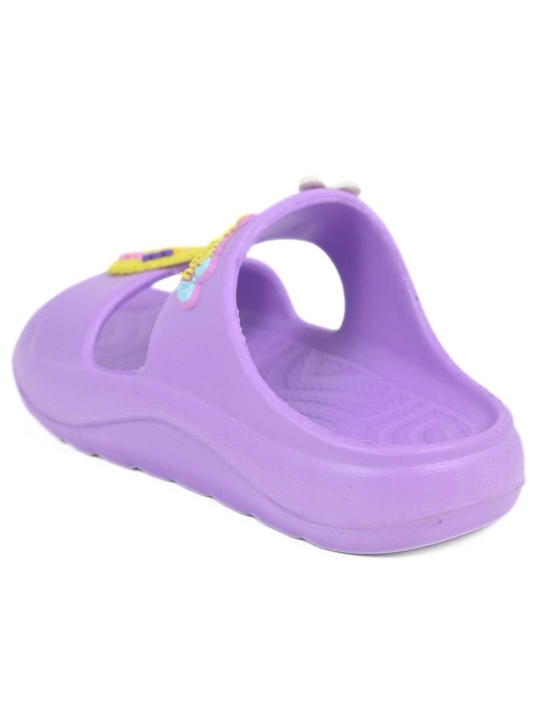 - Trendy Purple Design - The vibrant purple shade with cheerful charms makes these slides stylish, versatile, and perfect for casual everyday looks.