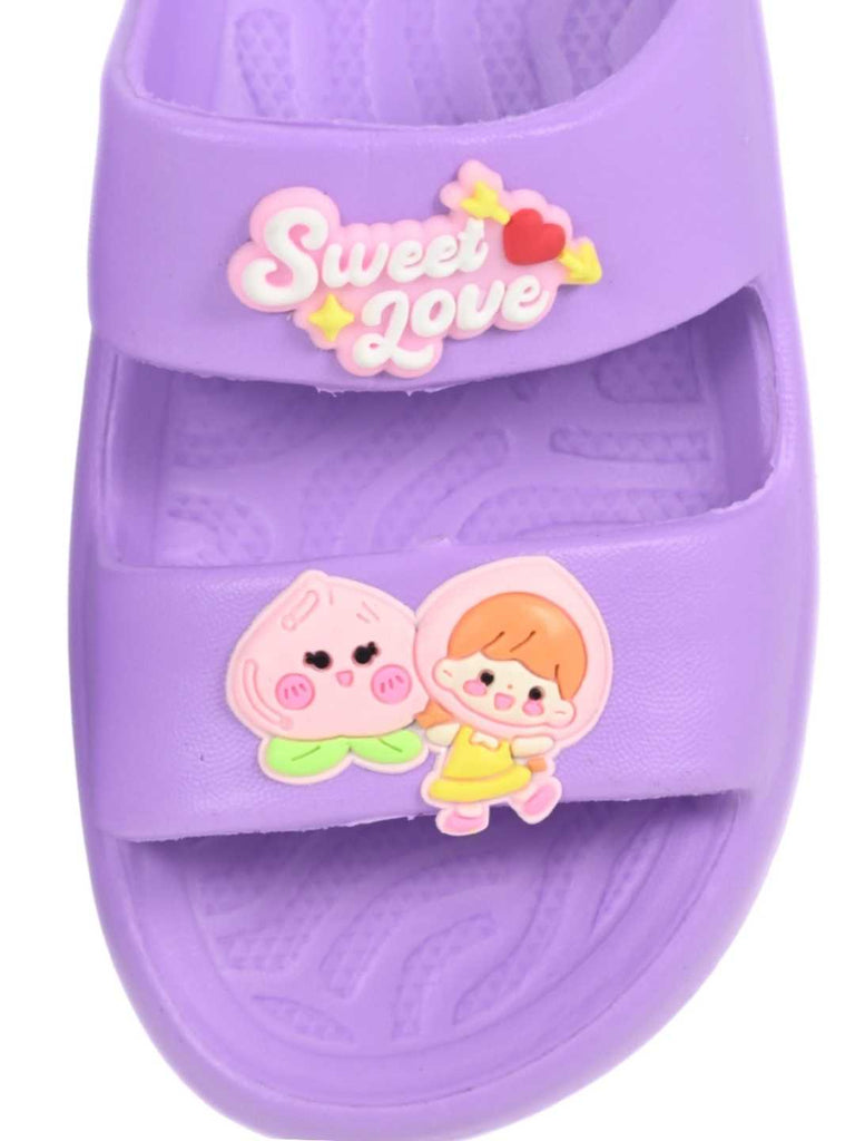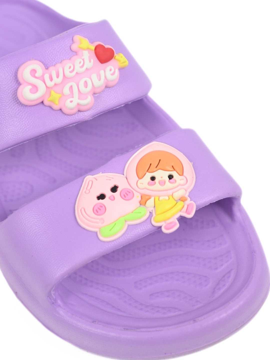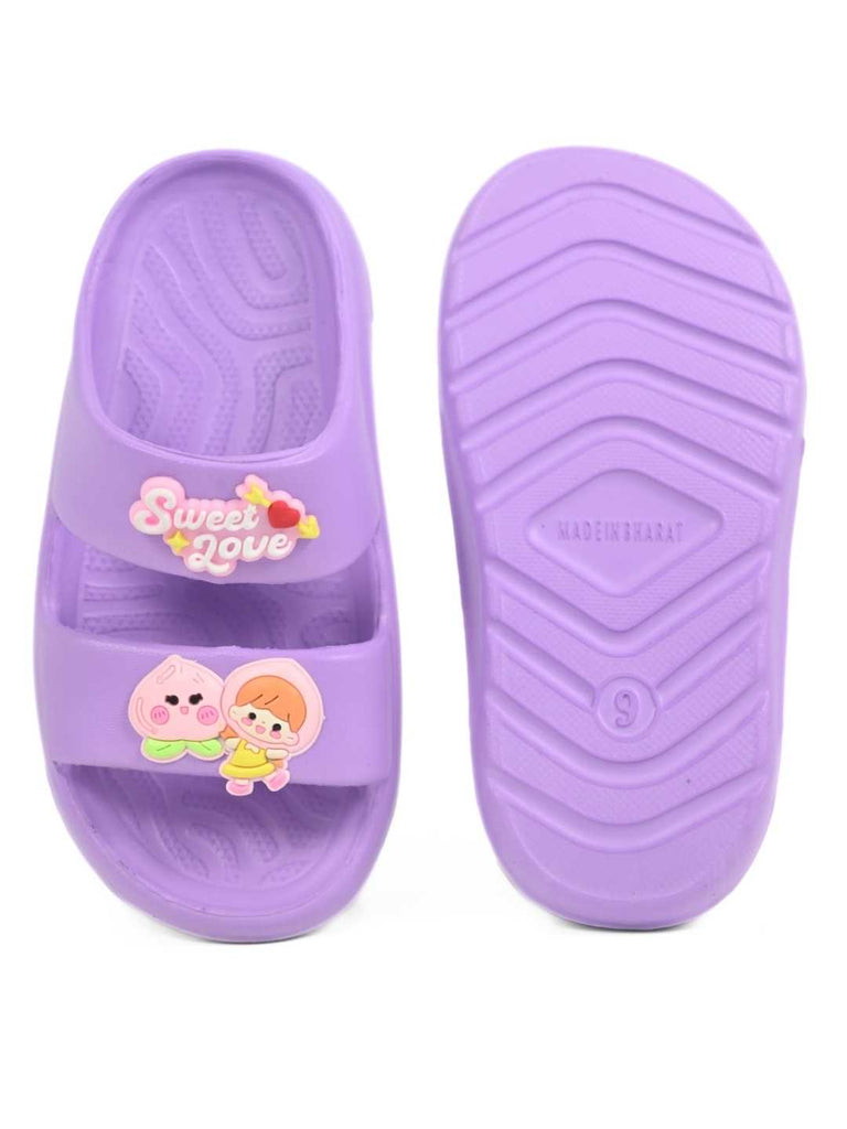 Step into a world of cuteness and comfort with Yellow Bee’s Charming Sweet Love Double Strap Slides in purple. Designed with adorable cartoon and heart charms that say “Sweet Love,” these slides instantly brighten up your little one’s day. Made from lightweight EVA, they provide lasting comfort for active feet while adding a splash of playful style. A perfect mix of fun, fashion, and functionality for growing kids.