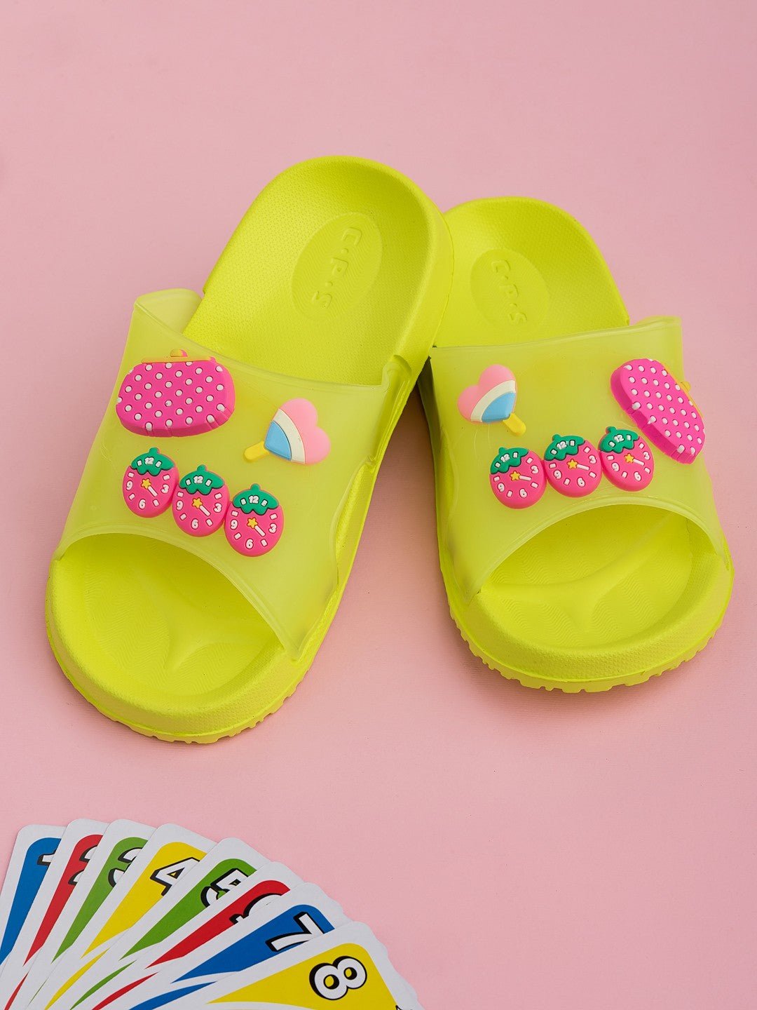 Cute & Comfy Strawberry, Purse & Heart Candy Charms Slides for Girls- Green