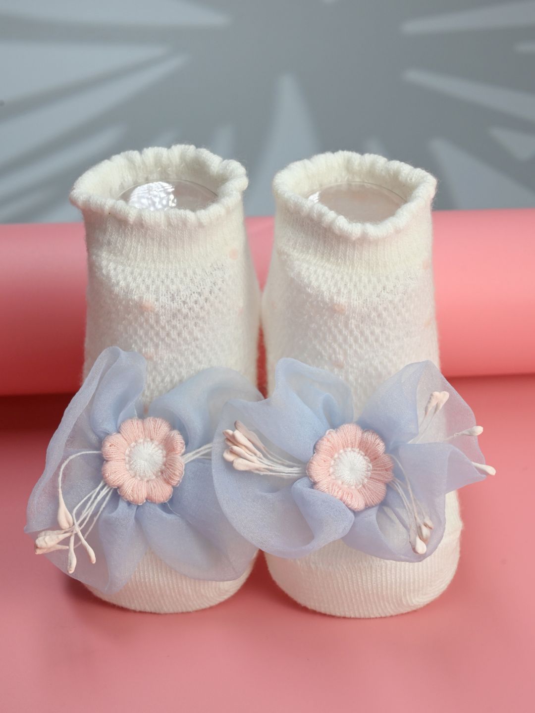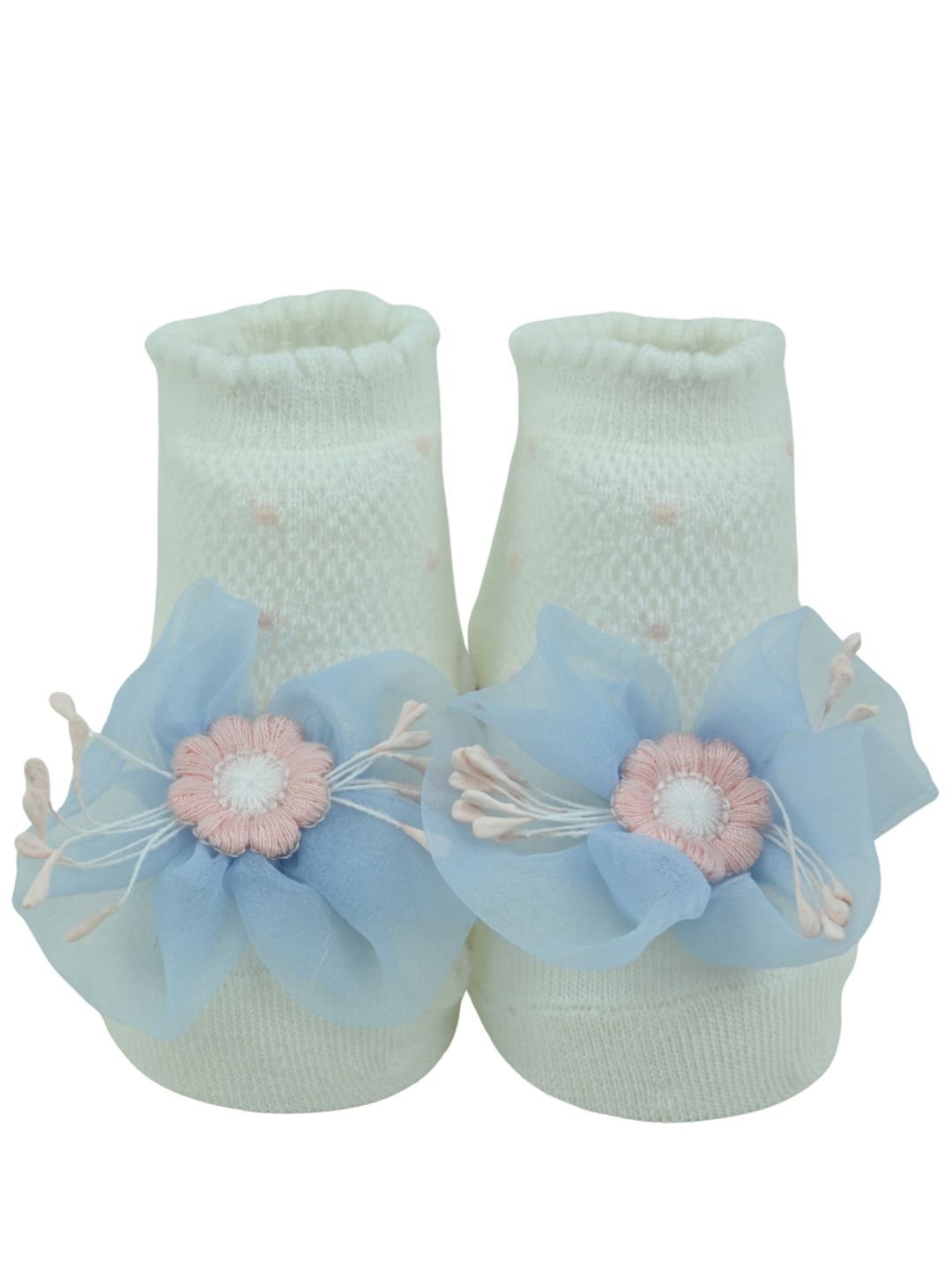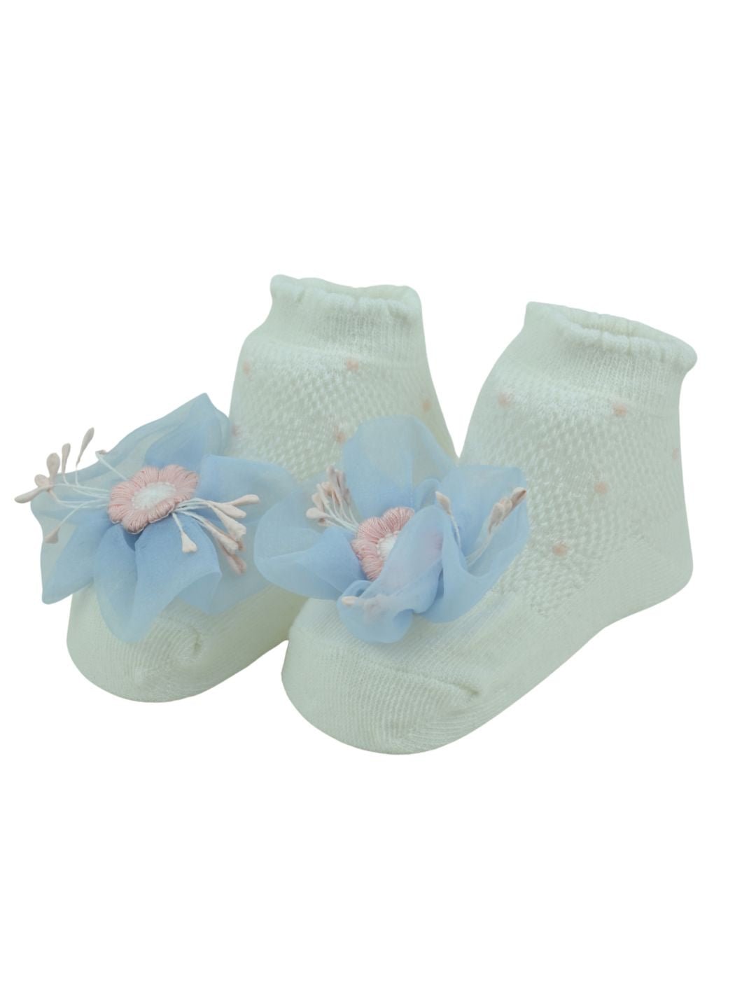 Make every little step extra special with the Pretty Baby Party Socks with Blue Flower Charm by Yellow Bee. Designed with love, these socks combine comfort and cuteness, making them an ideal choice for parties, festive wear, or gifting. The white cotton base paired with a delicate blue daisy applique adds a timeless charm to your baby girl’s outfit.
