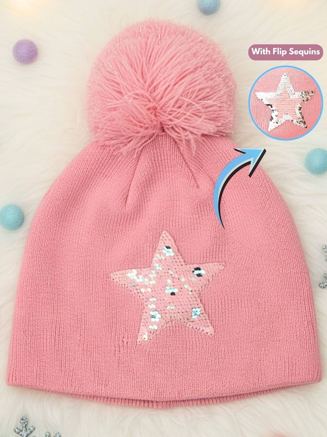 Reversible Sequins Star Hat with Pom-Pom for Girls