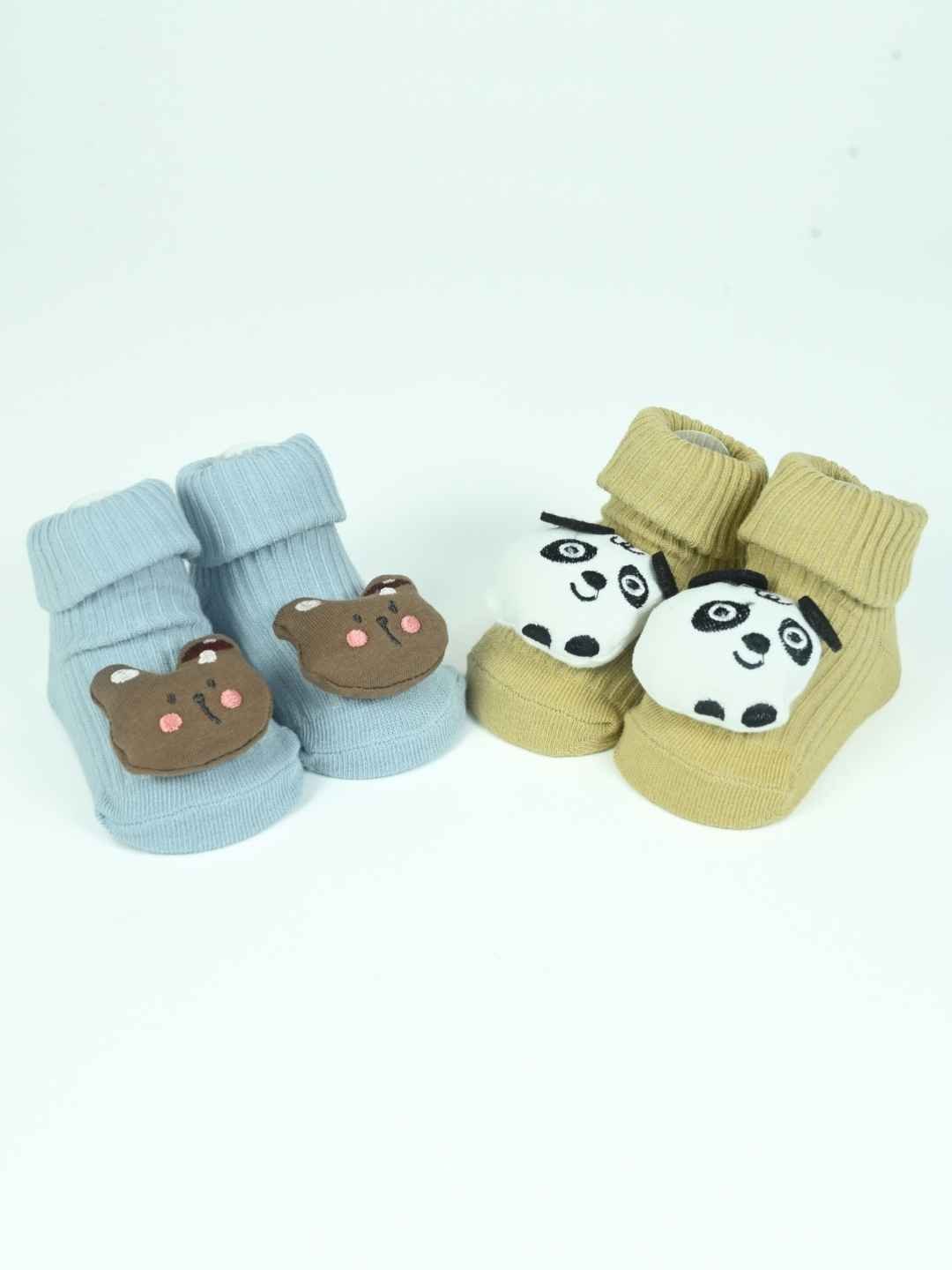 Wrap your baby boy's tiny feet in adorable comfort with the Snuggle Critters Baby Socks Pack by Yellow Bee. This charming set includes two pairs of doll-head socks featuring irresistibly cute 3D panda and teddy bear faces. Crafted from ultra-soft cotton and styled in soothing blue and brown tones, these socks ensure a cozy fit while adding a playful flair to your baby’s outfit. Whether it’s for a stroll in the park or a cozy day indoors, these socks are as functional as they are fun—keeping little toes warm and steady with their secure, non-slip grip.