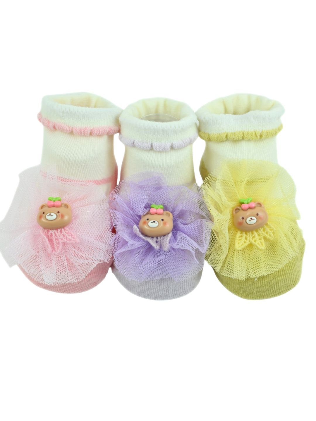 Soft Cotton Baby Girl Socks Set with Bear & Flower Design - Multi