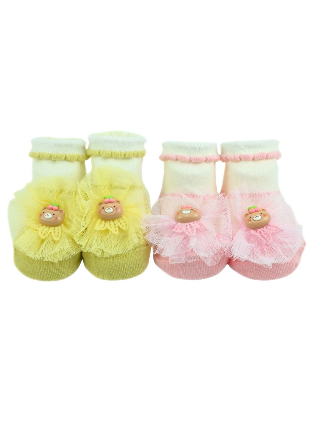 Stylish Baby Cotton Socks with Bear & Tulle Design for Girls – Pink & Yellow