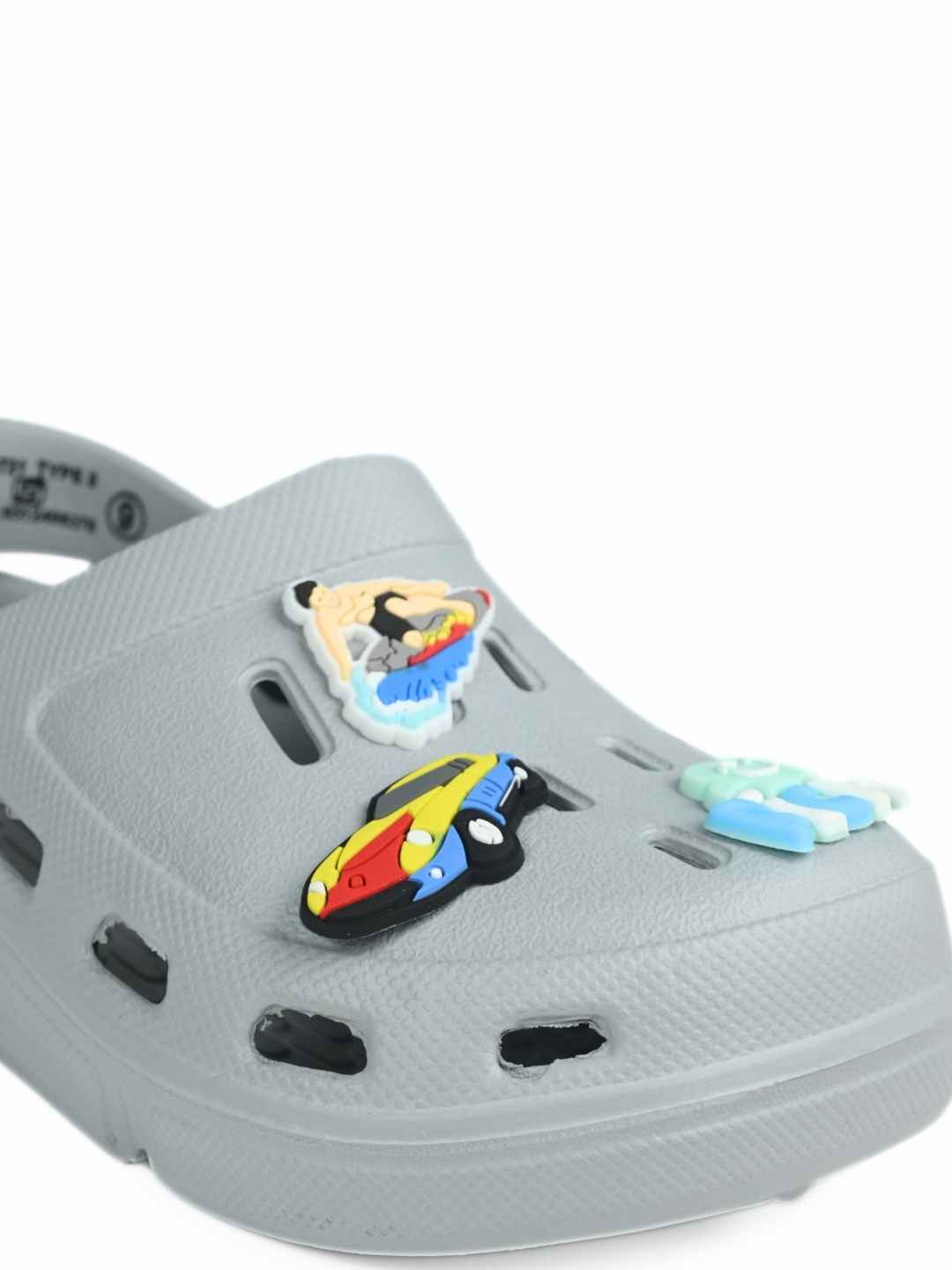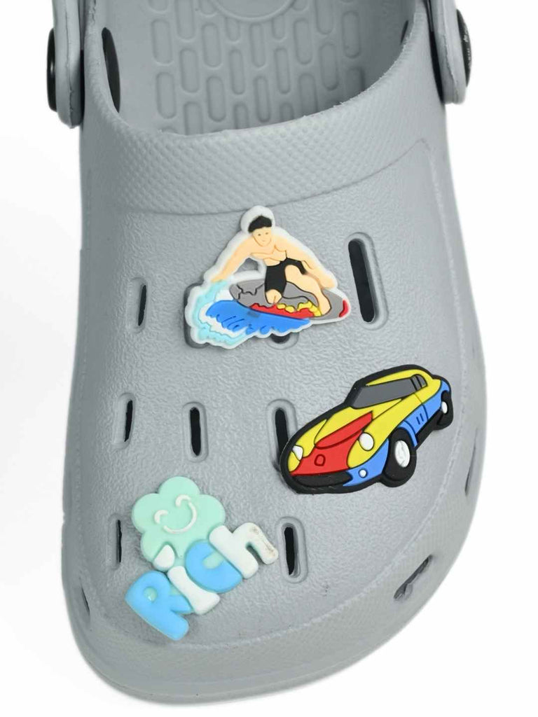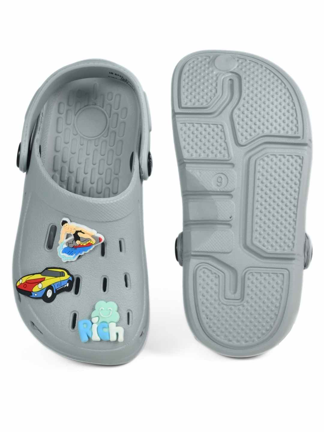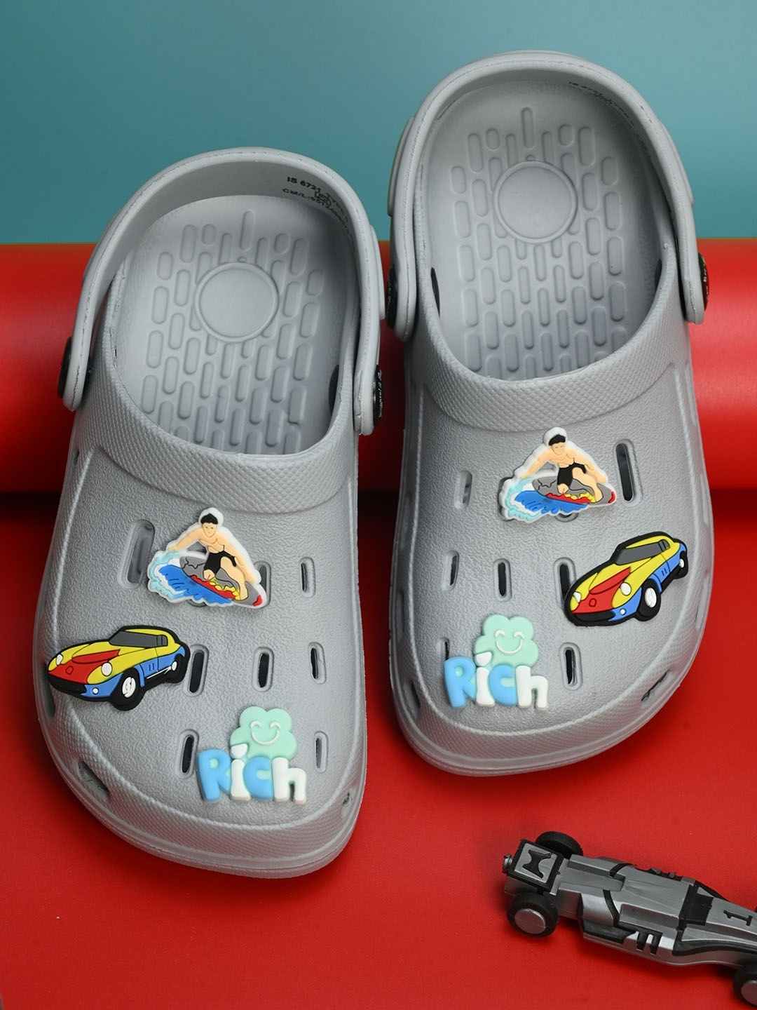 Stylish Grey Clogs with Surfing, Racing Car & 'Rich' Charm for Boys