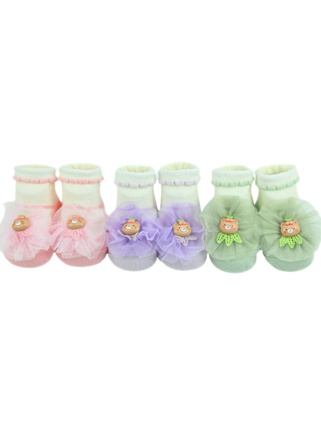 Sweet Baby Cotton Socks with Bear & Floral Design for Girls- Pink, Purple & Green
