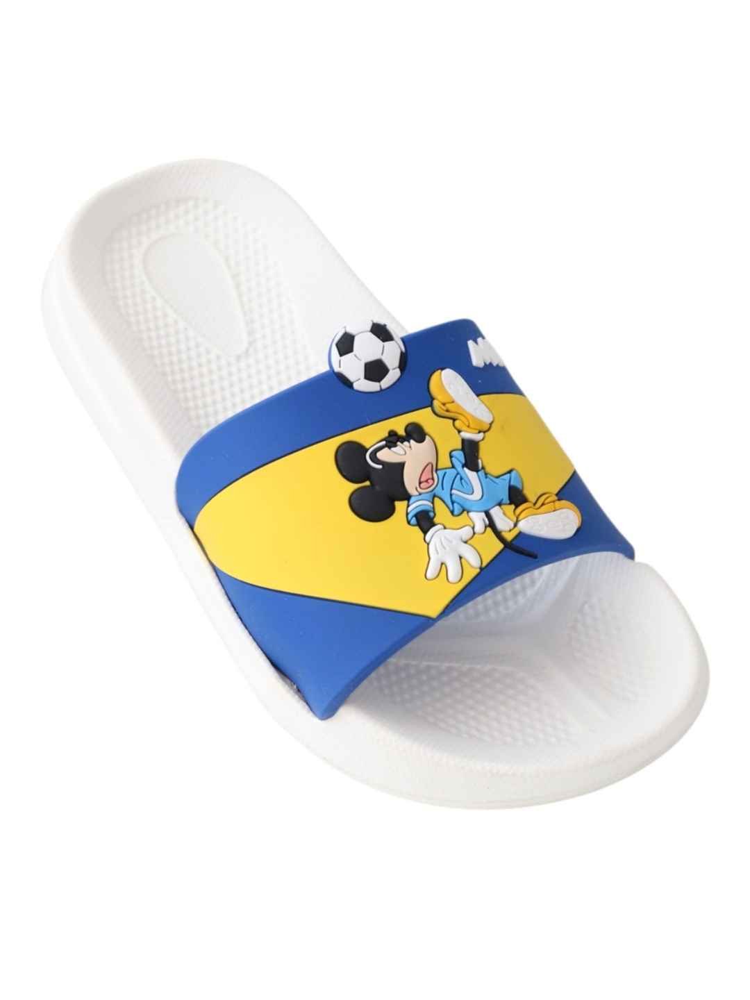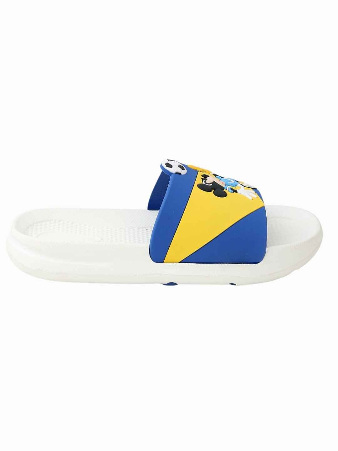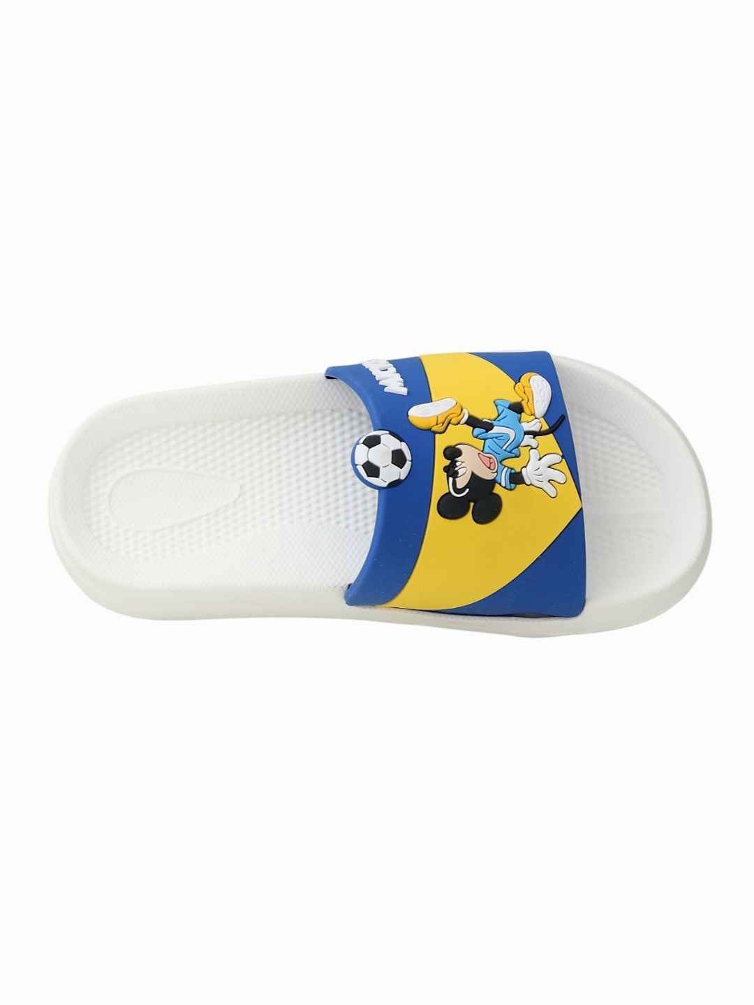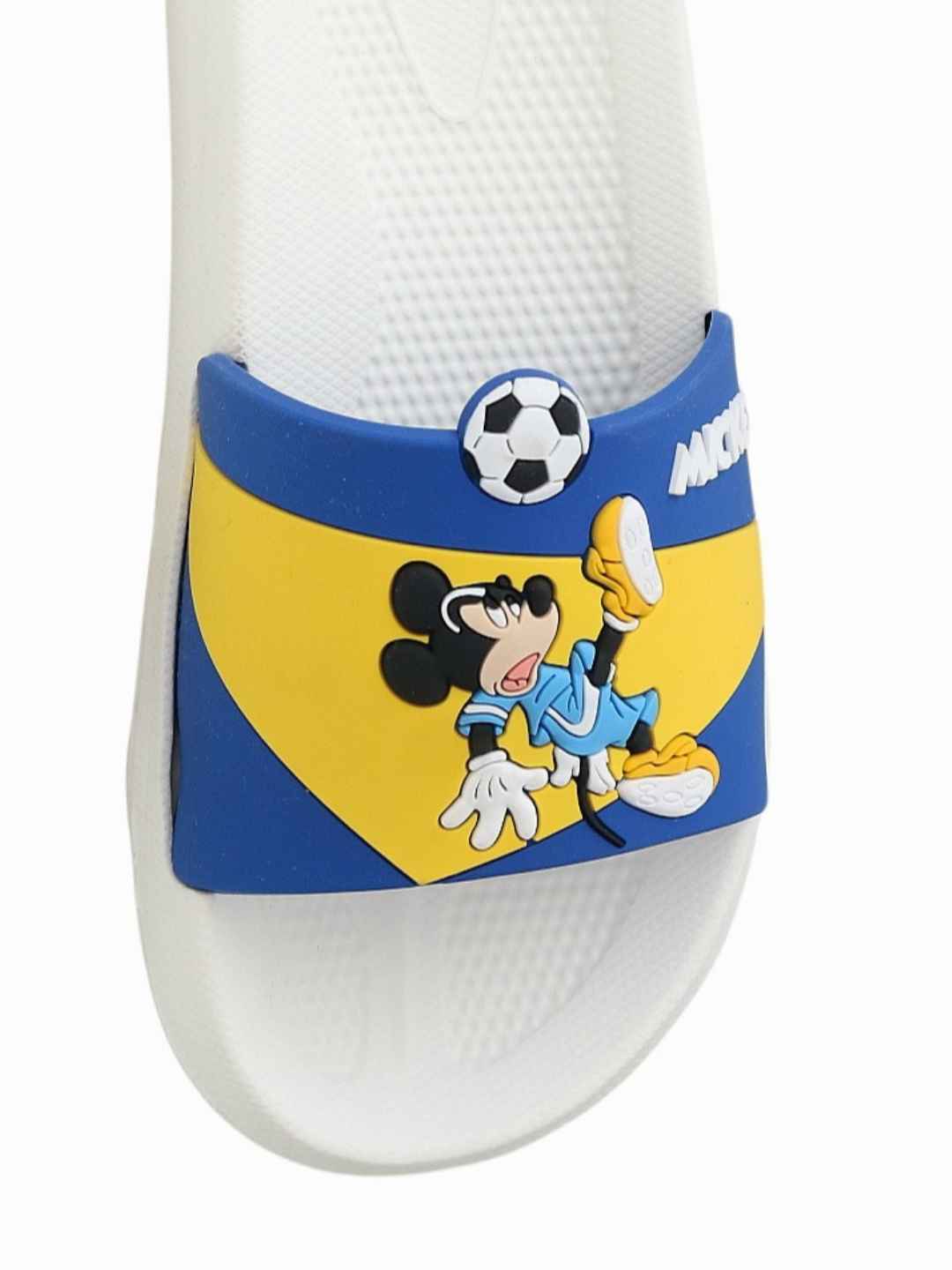 Bring sporty fun and Disney magic together with the Yellow Bee Boys Disney Mickey Mouse Soccer Design Slides in White. Featuring a playful Mickey Mouse football action graphic with a soccer ball detail, these slides are designed to delight little lovers. The clean white sole combined with bold blue and yellow closure accents creates a fresh, energetic look, while the lightweight EVA construction ensures superior comfort for everyday adventures.