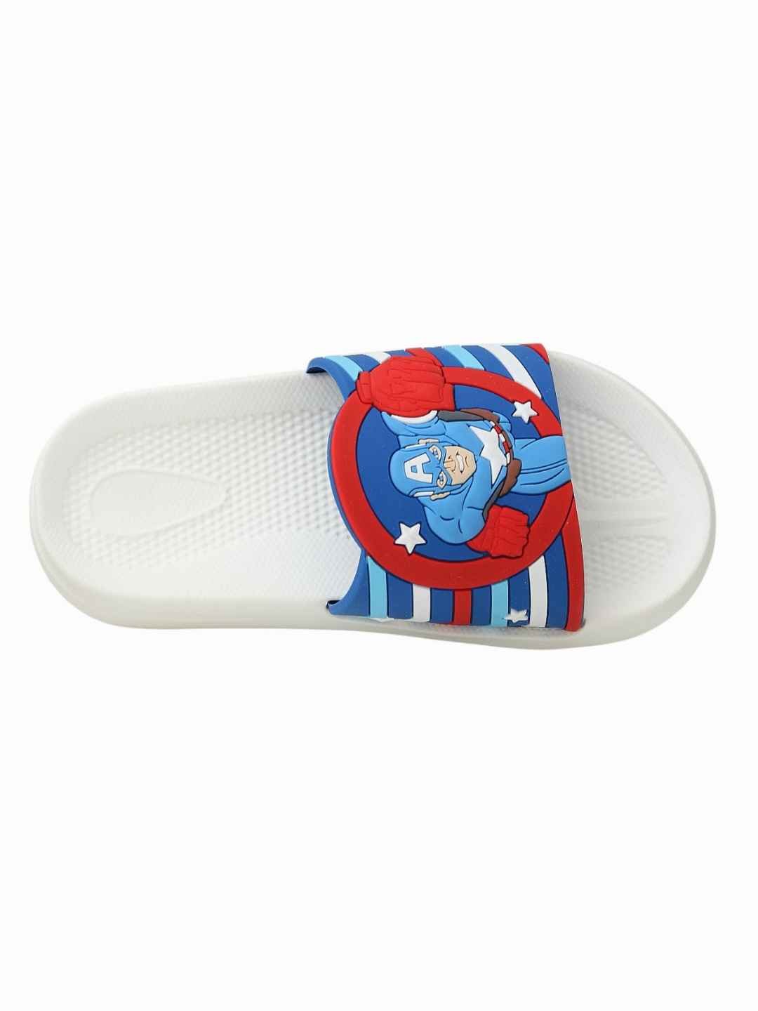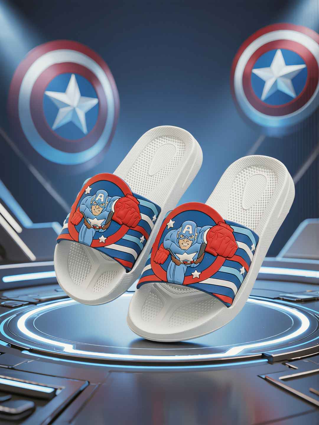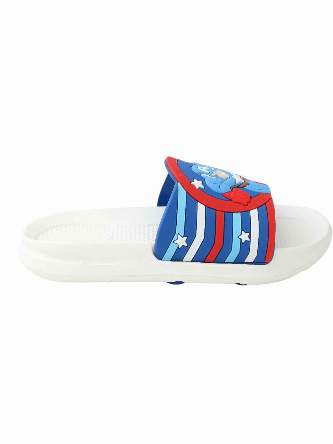 Let your little hero step into action with the Yellow Bee Boys Marvel Captain America Design Slides in White. Featuring a bold Captain America shield-inspired graphic with dynamic character detailing, these slides bring superhero energy to everyday wear. The clean white base enhances the vibrant red and blue design, while the lightweight EVA construction ensures superior comfort—making them perfect for active boys who love adventure and style.