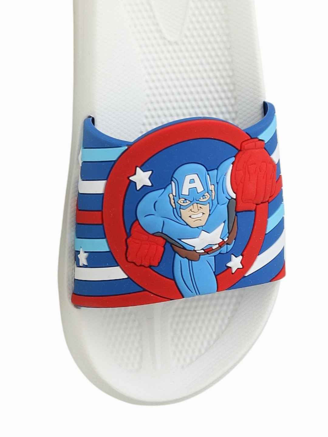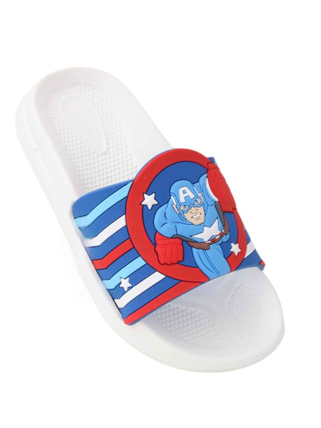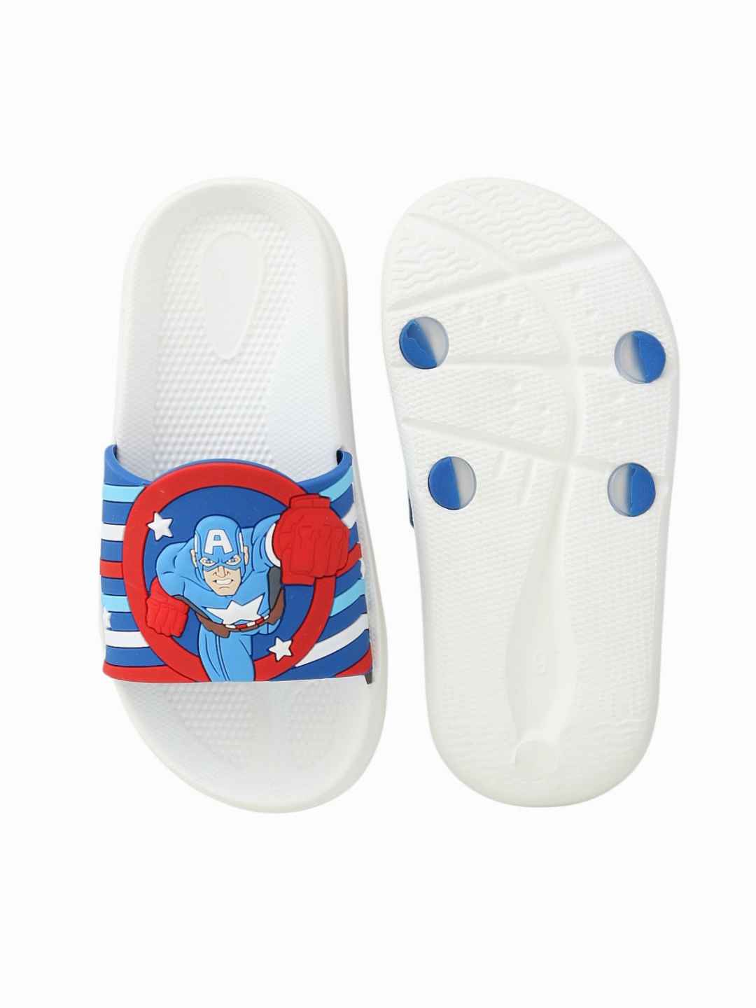 Let your little hero step into action with the Yellow Bee Boys Marvel Captain America Design Slides in White. Featuring a bold Captain America shield-inspired graphic with dynamic character detailing, these slides bring superhero energy to everyday wear. The clean white base enhances the vibrant red and blue design, while the lightweight EVA construction ensures superior comfort—making them perfect for active boys who love adventure and style.