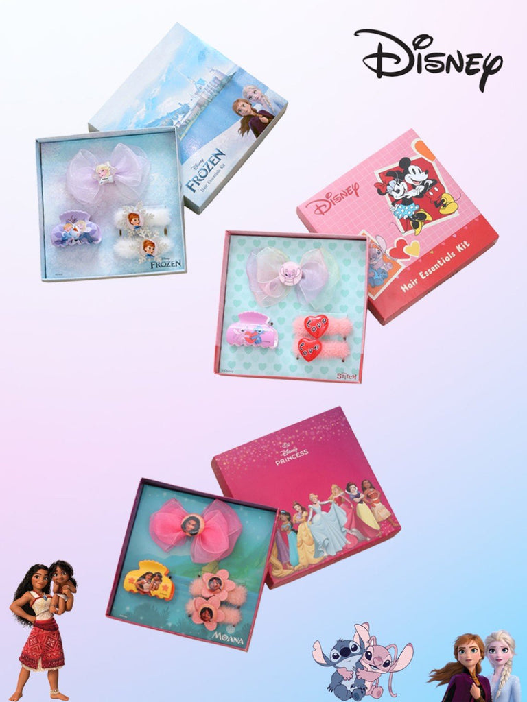 Let your little girl sparkle like her favorite Disney character with the Disney by Yellow Bee Hair Essentials Gift Set! This 3-in-1 character combo features Moana, Frozen’s Elsa & Anna, and Stitch in charming pink-themed accessories. Each 4-piece pack includes a show-stopping bow, a vibrant character clutcher, and two adorable furry clips – all crafted from child-safe plastic and soft fabric for a snug, no-pull fit. These magical accessories add a fun, fairytale touch to any hairstyle – from ponytails to party-ready updos!