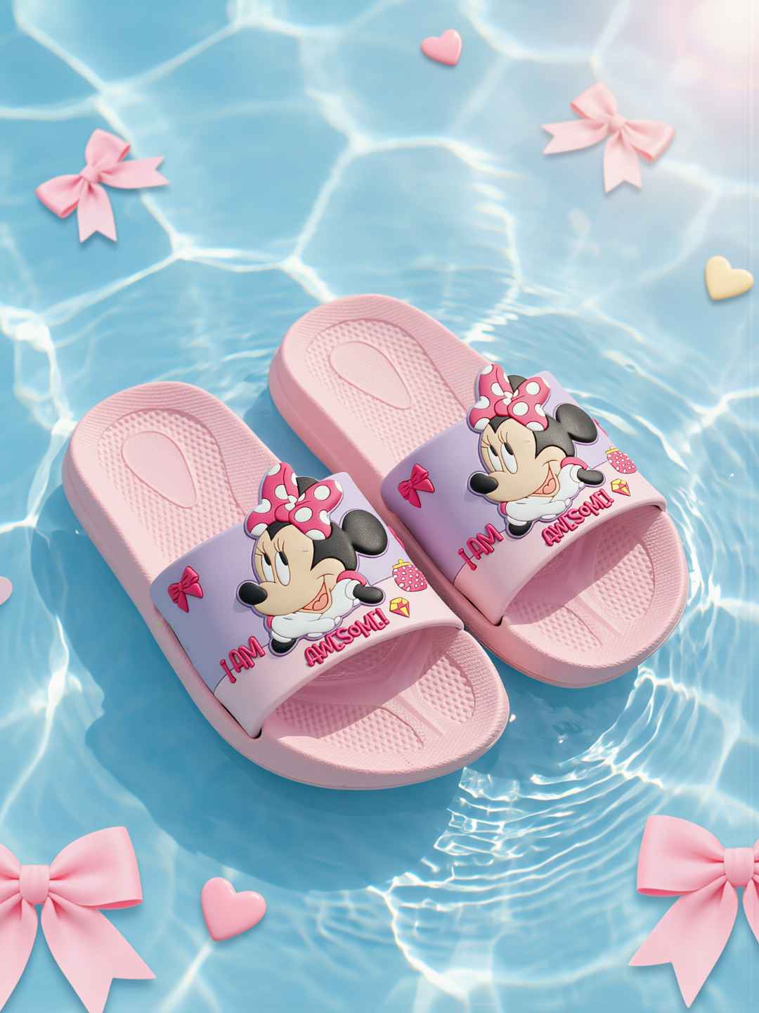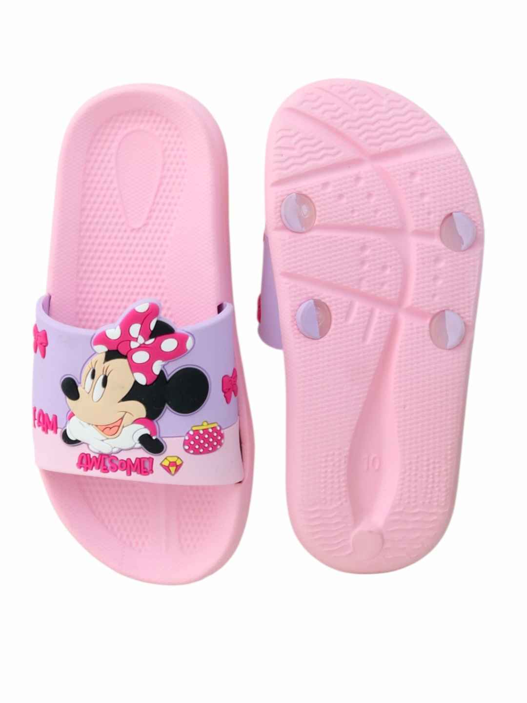 Add a touch of Disney magic to everyday comfort with the Yellow Bee Girls Disney Minnie Mouse Slides in Pink. Designed with an adorable Minnie Mouse graphic and signature polka-dot bow, these slides bring playful charm to every step. Crafted from lightweight EVA material, they deliver soft cushioning and effortless wear, making them a perfect blend of style, comfort, and practicality for active little girls.