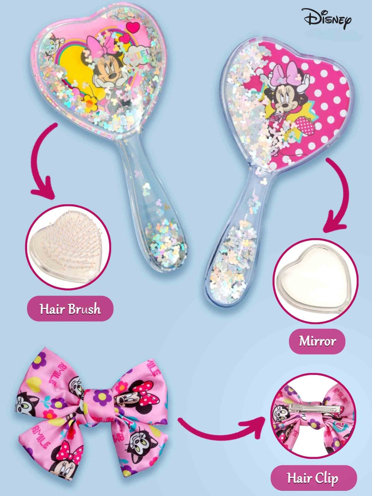 Yellow Bee Girls’ Disney Minnie Mouse Glitter Filled Hairbrush & Mirror Set with Bow Clip Grooming Kit Box - Multi